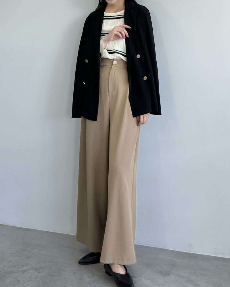 ハイウエストとセンタープレスが、脚をまっすぐ長く、スラッと美しく見せます。