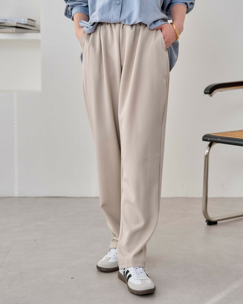 ハイウエスト設計とセンタープレスの視覚効果で、スラッと脚長な印象を与えます。