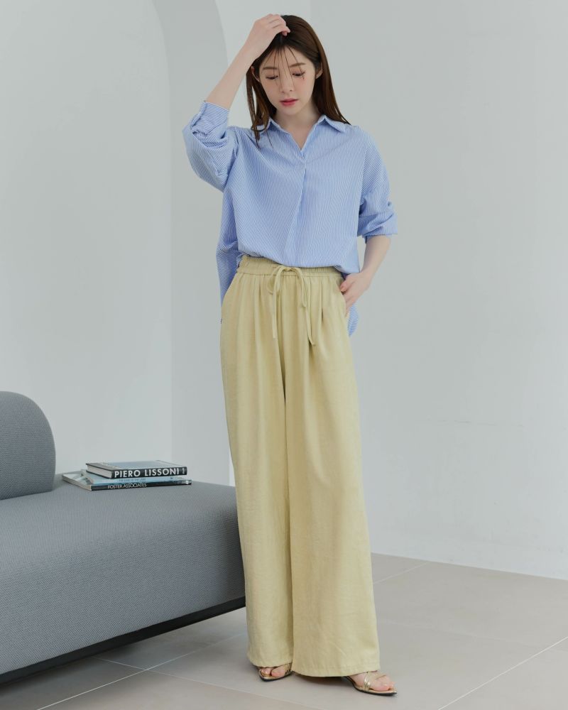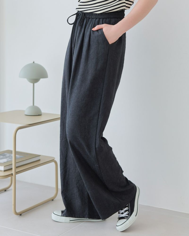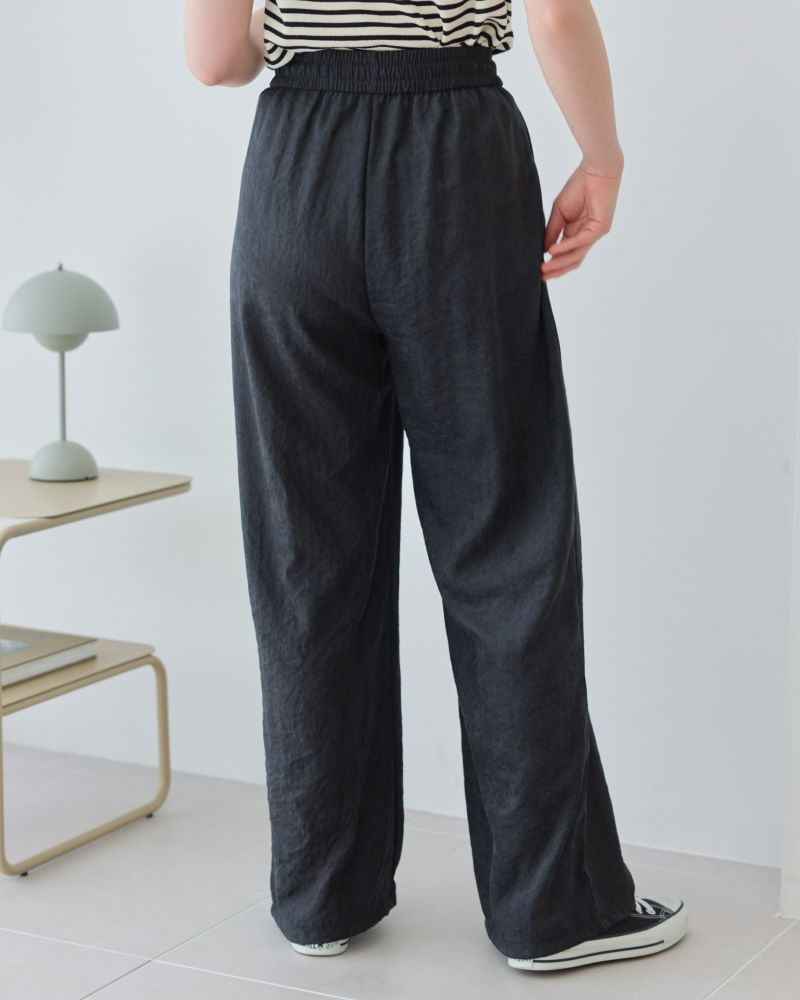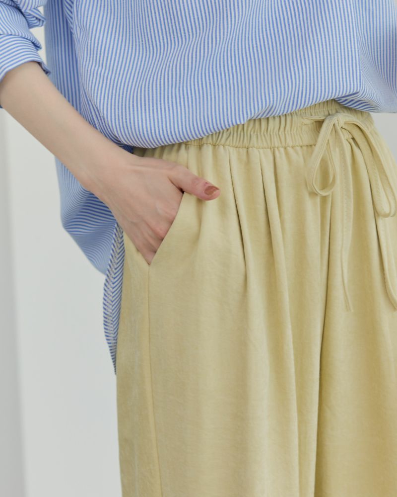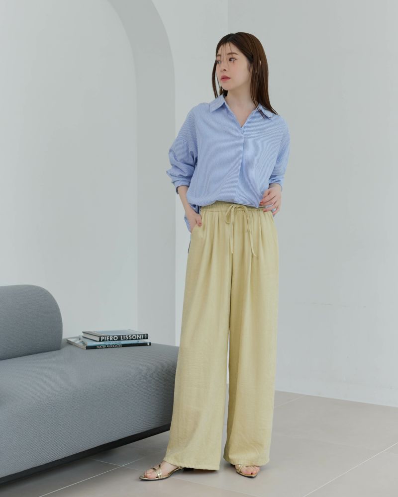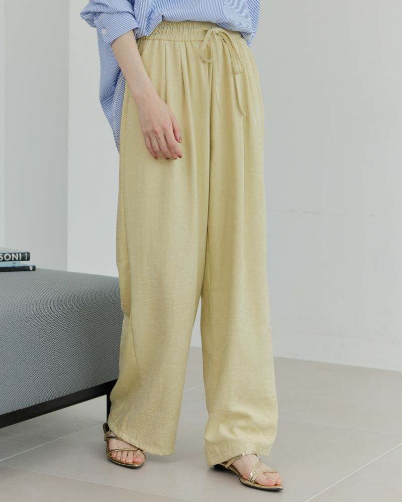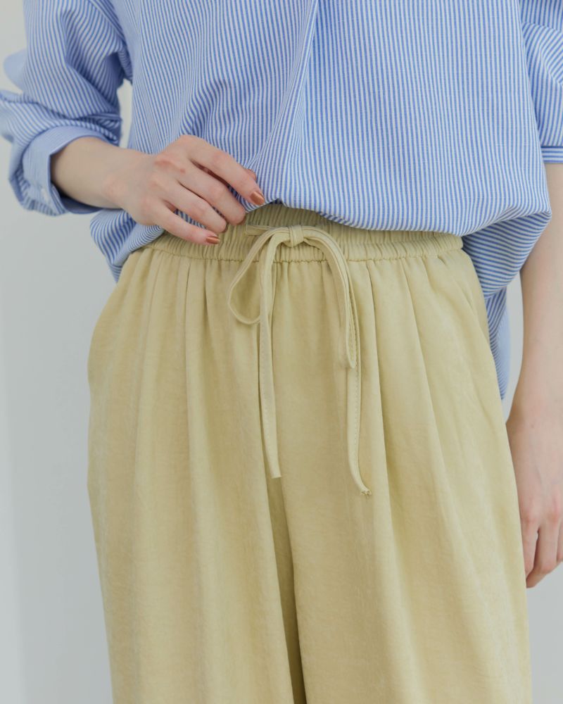 161~162センチくらいの身長で、そんなに細みでもない私が履いて、ペタンコ靴だと階段などで少し裾が気になります。ウエストは他のイージーパンツよりもやや締めつけ強めに感じました。 カラーが春夏らしく、目を引くので、主役級アイテムです。 爽やかなコーデにおすすめです!