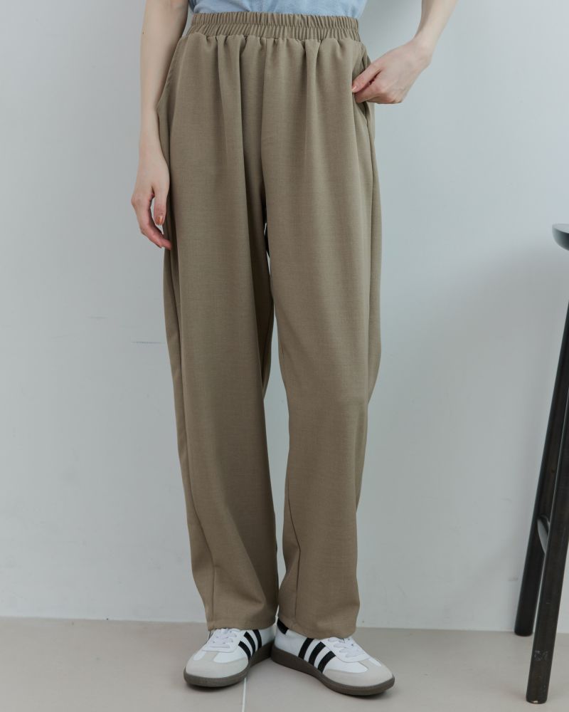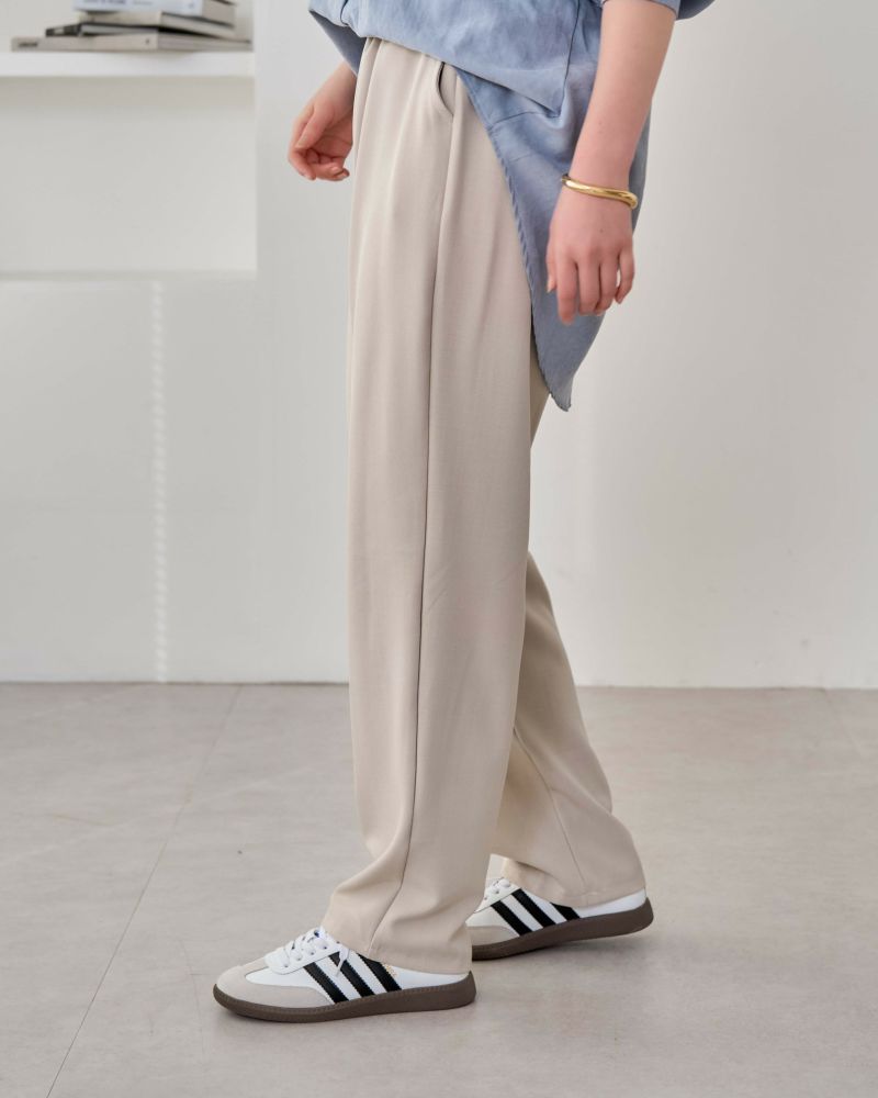 ハイウエスト設計とセンタープレスの視覚効果で、スラッと脚長な印象を与えます。