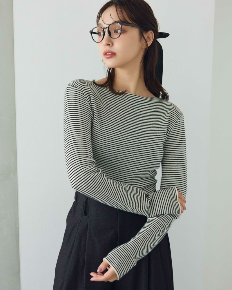 ・ピッチの細かいボーダー柄で、カジュアルすぎず、上品な印象と着痩せ効果を両立しました。