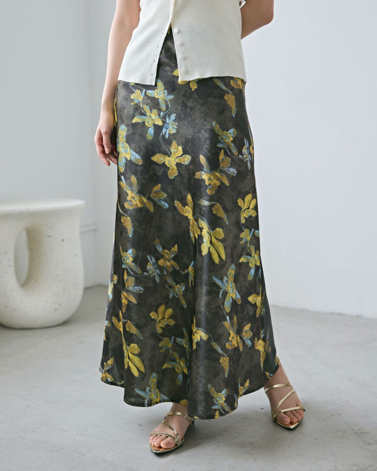 an chic フラワーサテンセミフレアスカート