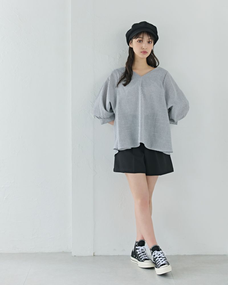 Vネックストライプフレアブラウス