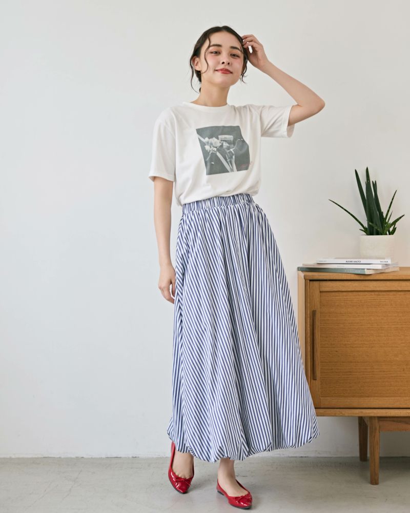 154cm、44kg、自称骨格ウェーブです。ユニ○クロさんとかでは普段Sサイズ着用してます。デザインが可愛く、私は最初からこっちのTシャツ一択でした🥰他の方が言われていることは私には気になりませんでした…。伸びはない方の生地感だとは思います。長さが少し短めなので低身長にはインするのに困らず、いい丈感です🫶(私では腰骨より少し下くらいで、おしりは全く隠れません)たくさん着たいと思います😘