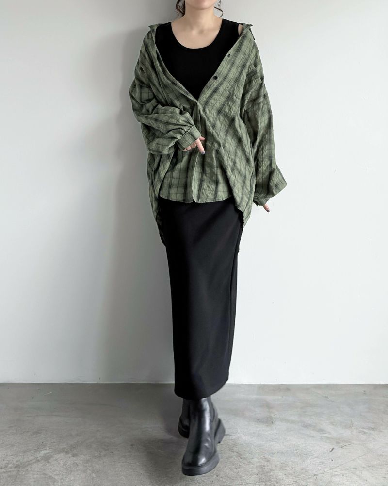 ぽっちゃり体型の私にはかなりパツパツですが、着れないことはないので、沢山着ています!インスタライブでお話していたように、伸びますが元に戻ろうとする力が強い、まさにそんな感です。