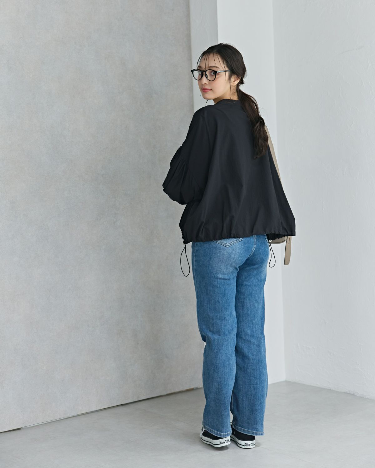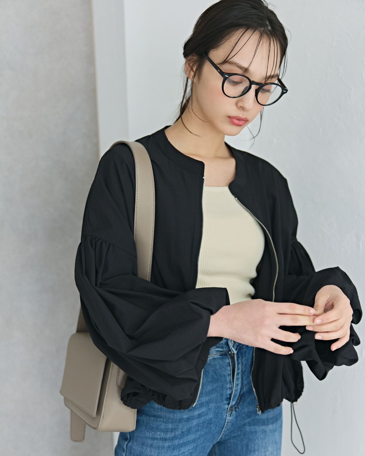 an chic ぽわんスリーブノーカラーライトブルゾン