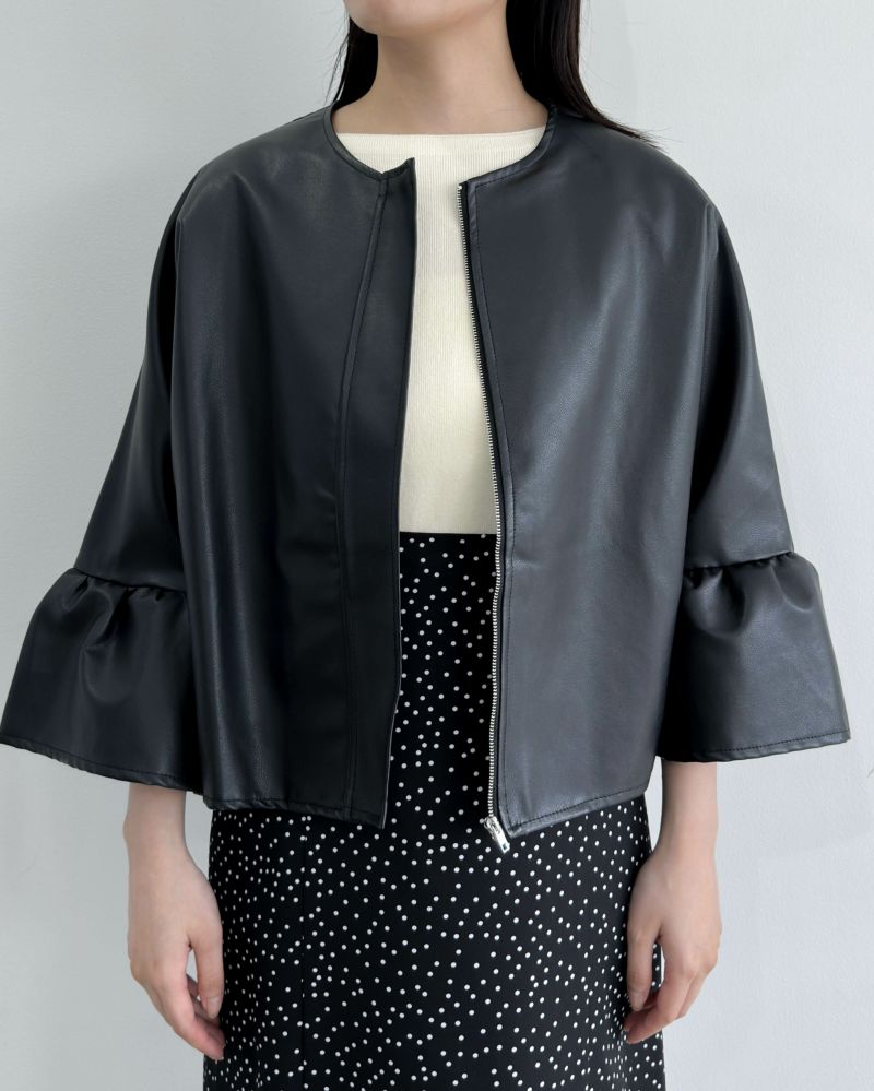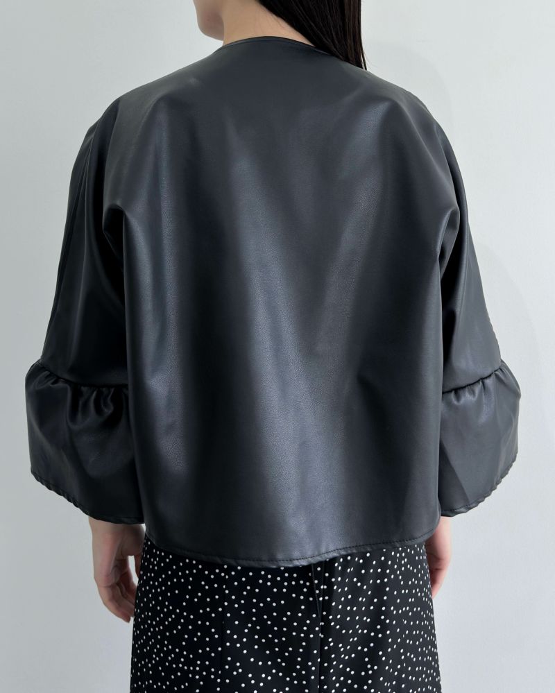 ノーカラーフレアスリーブフェイクレザーブルゾン