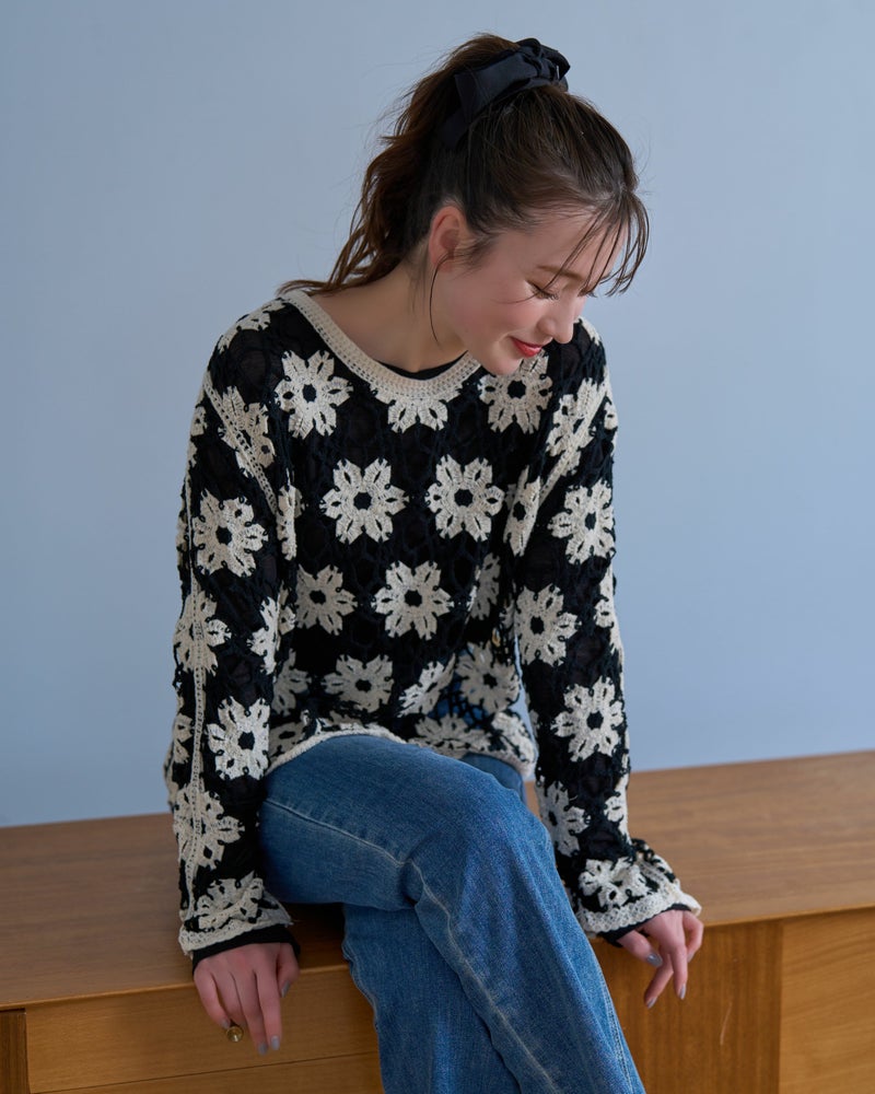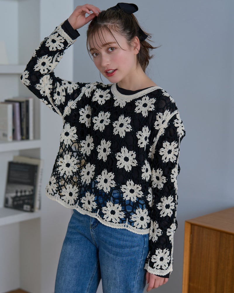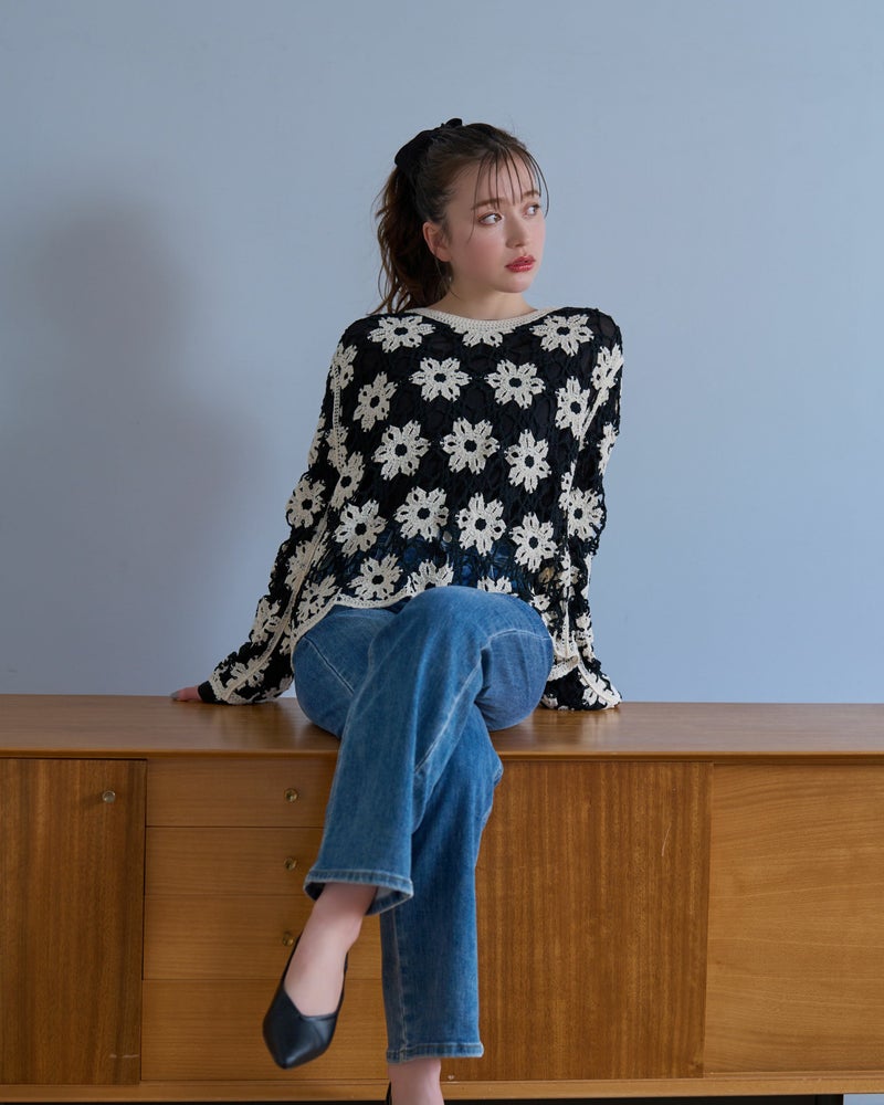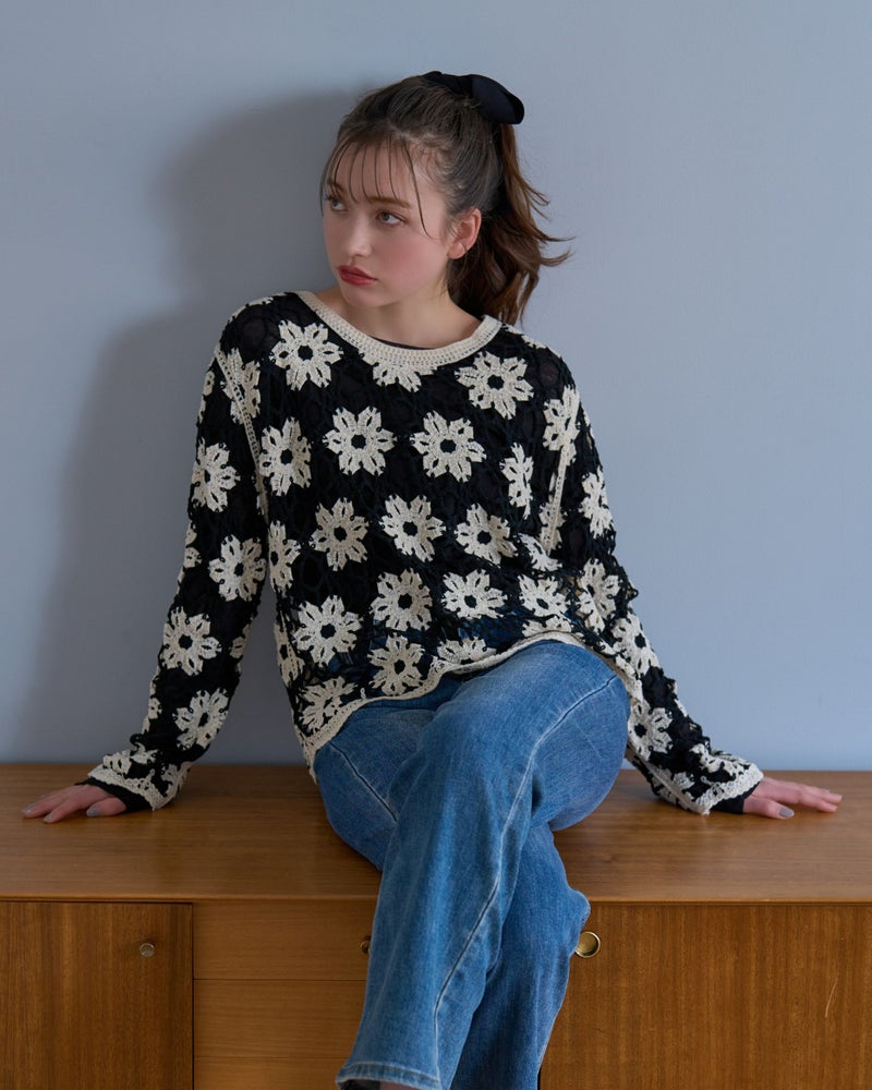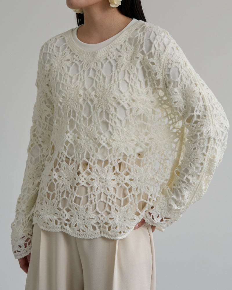 鍵編みフラワープルオーバー