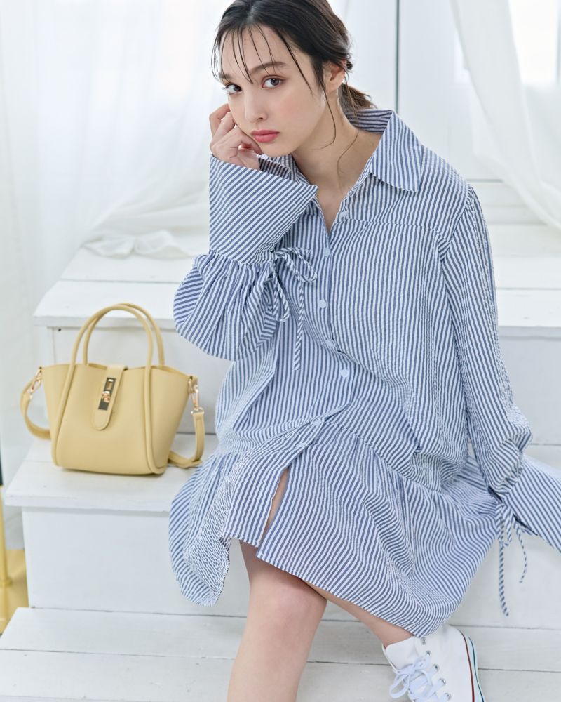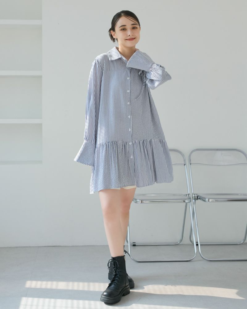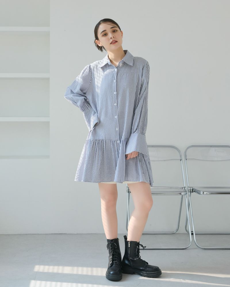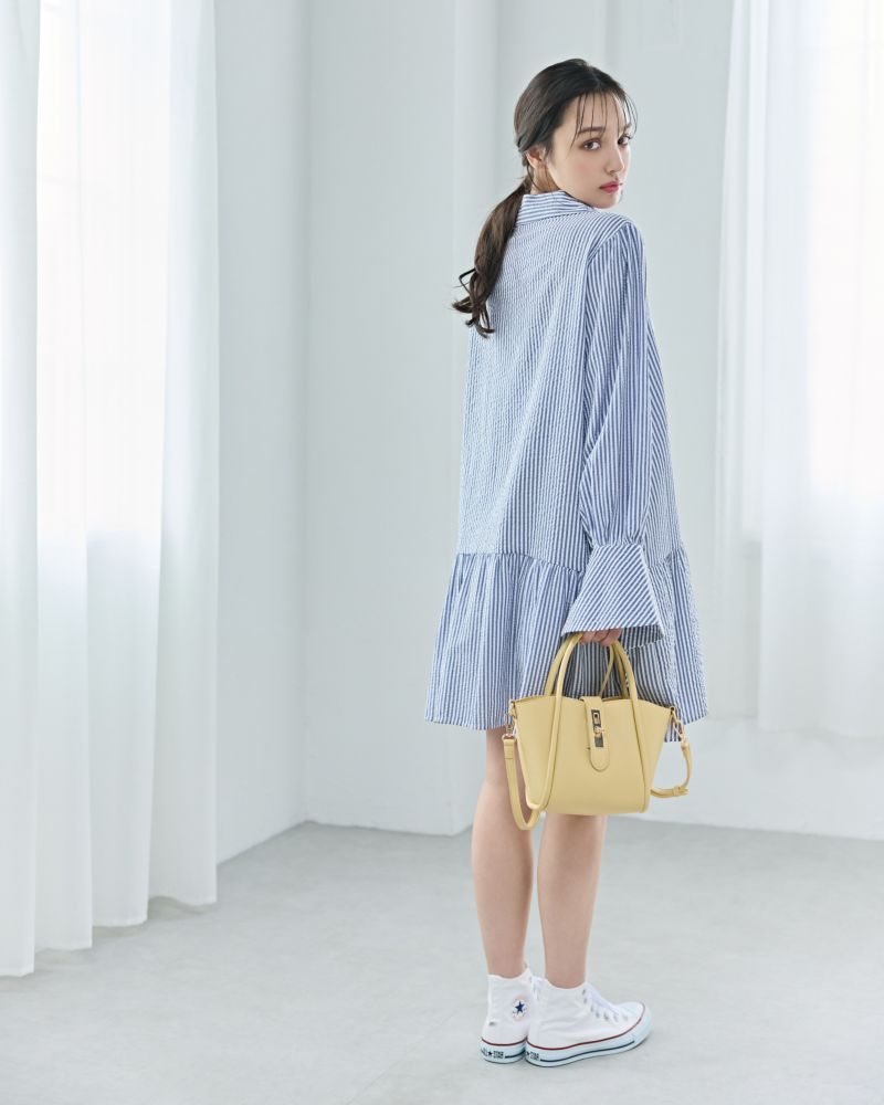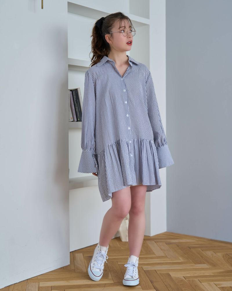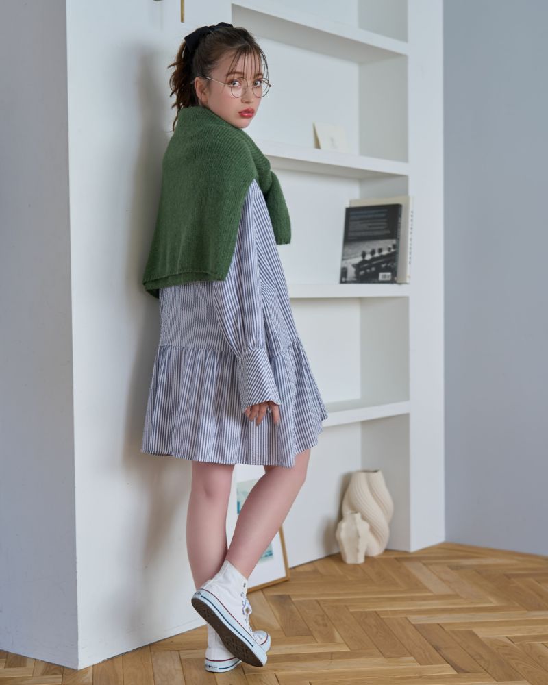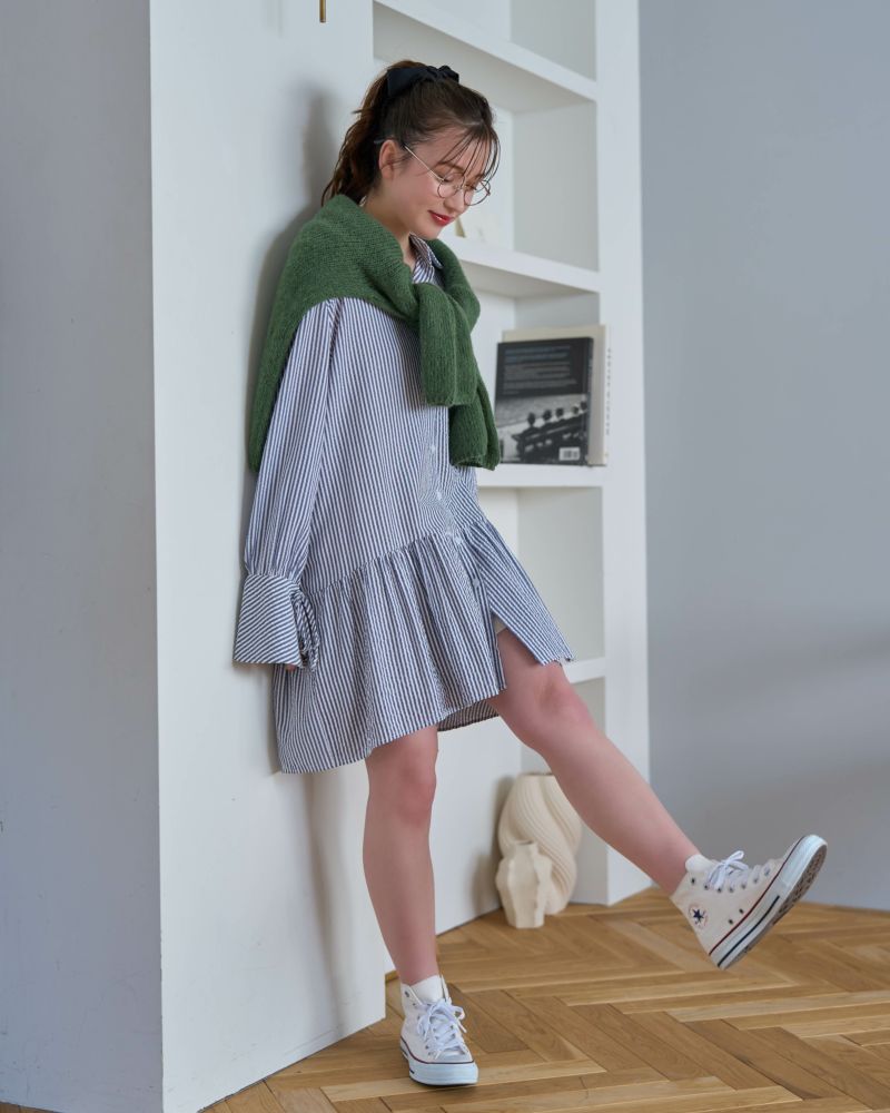 ストライプ柄でミニ丈でも大人カジュアルに。