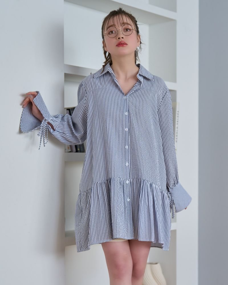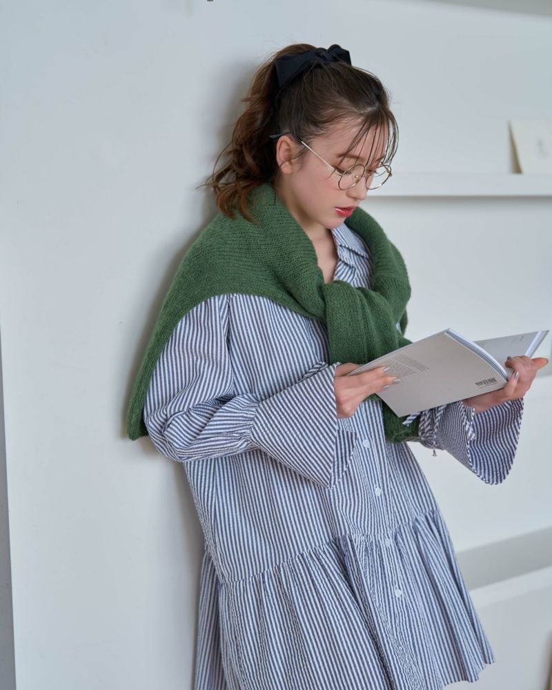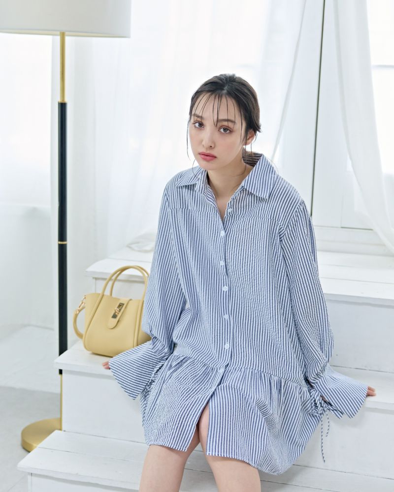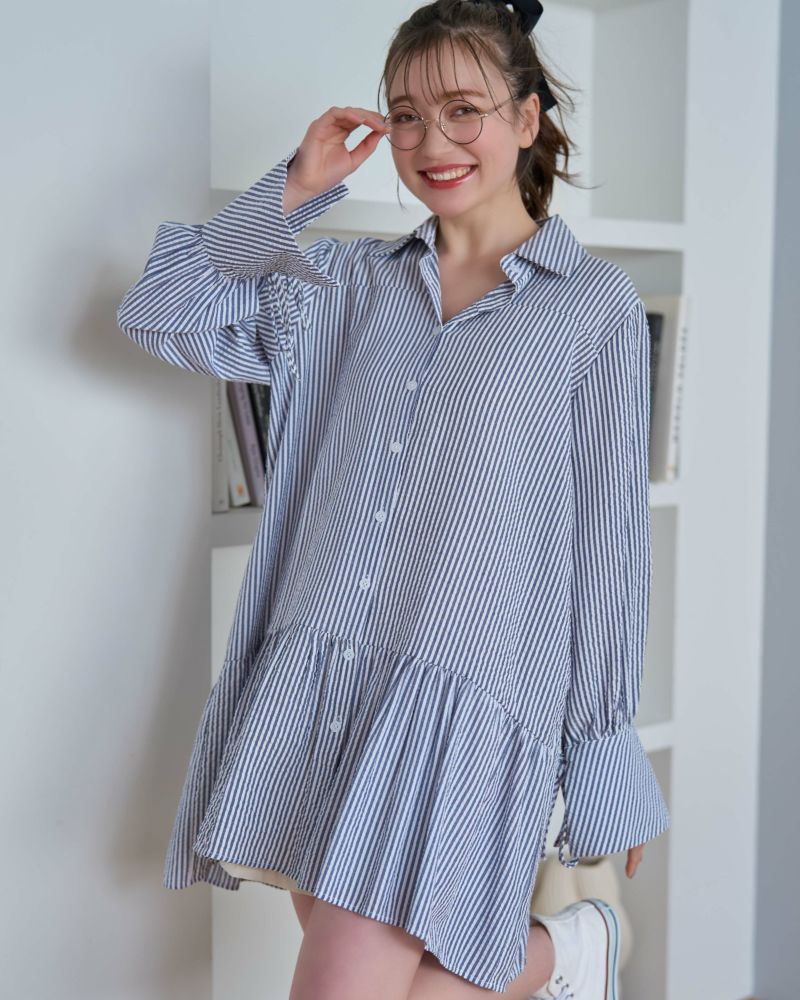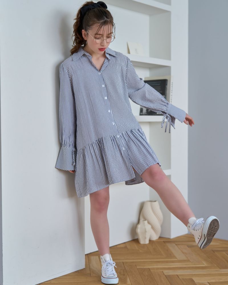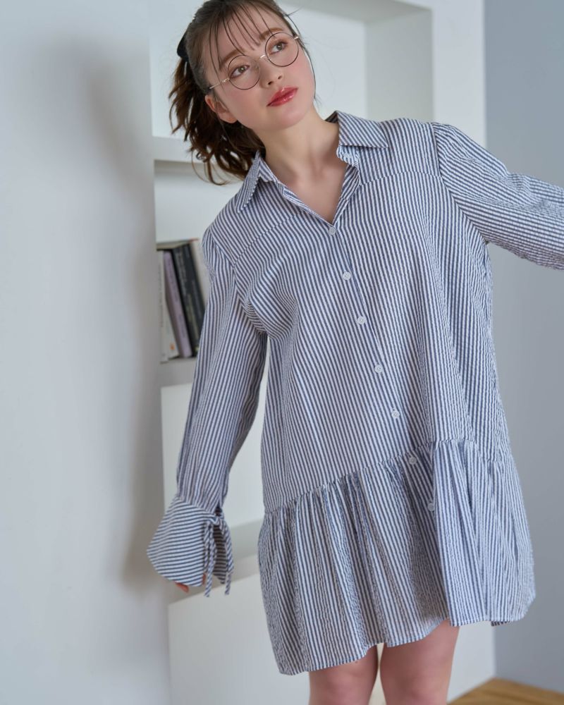 ストライプ柄でミニ丈でも大人カジュアルに。