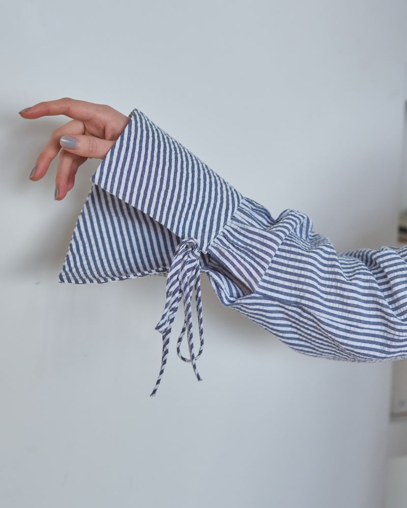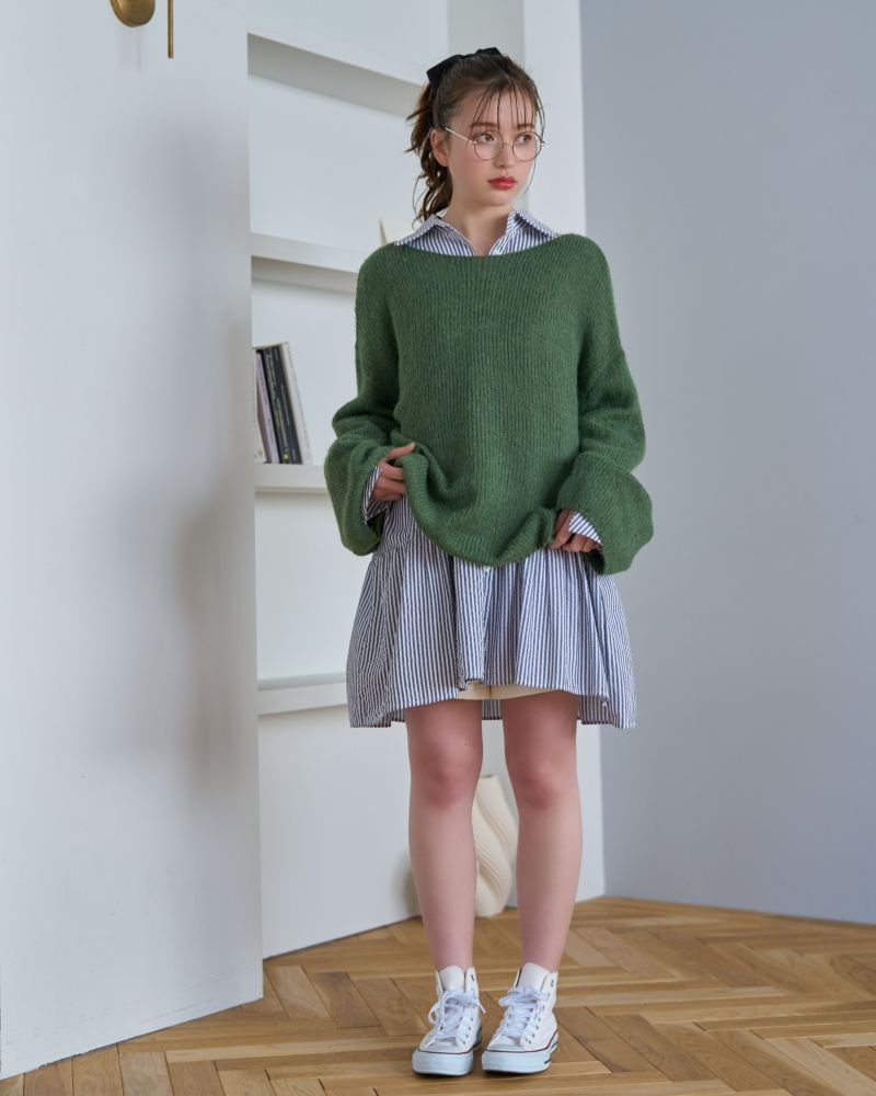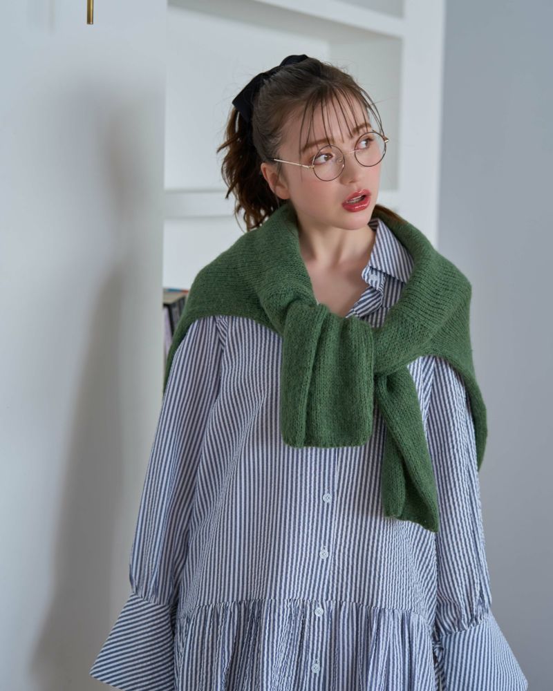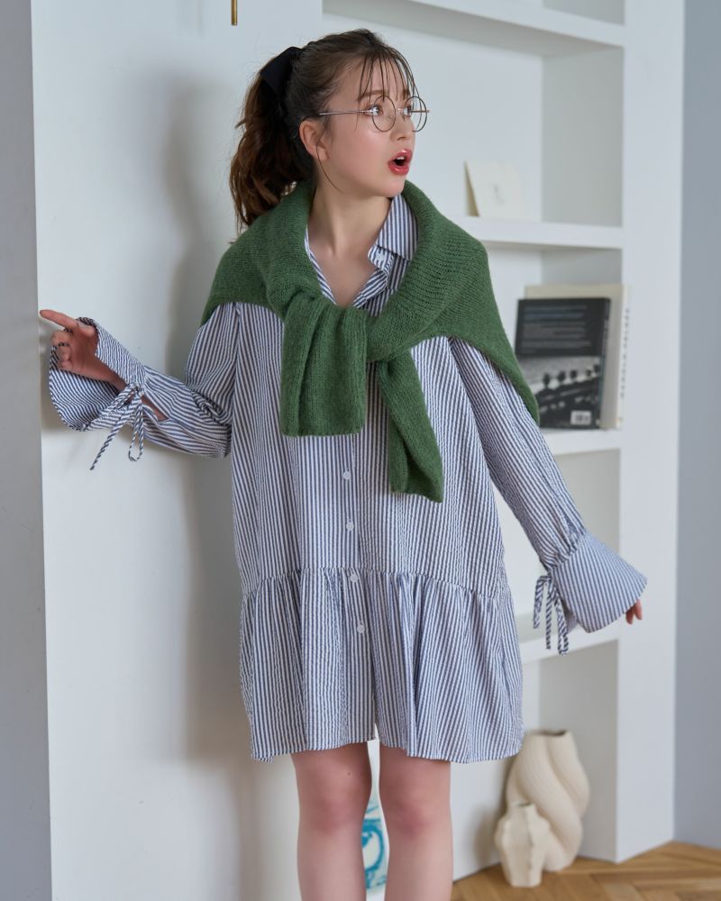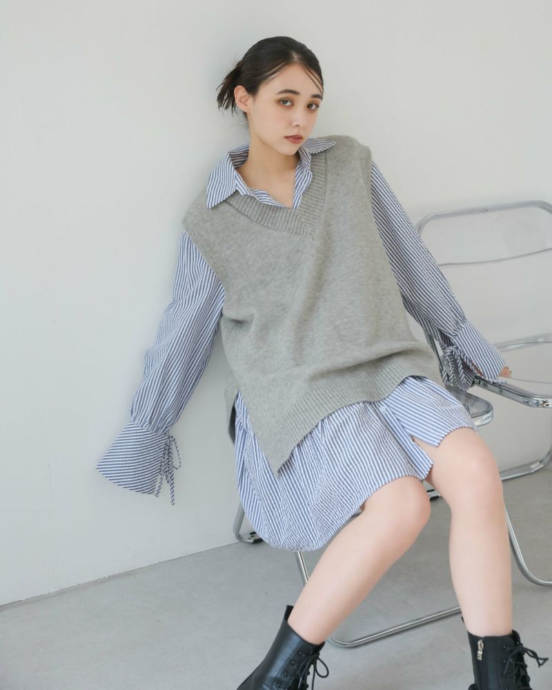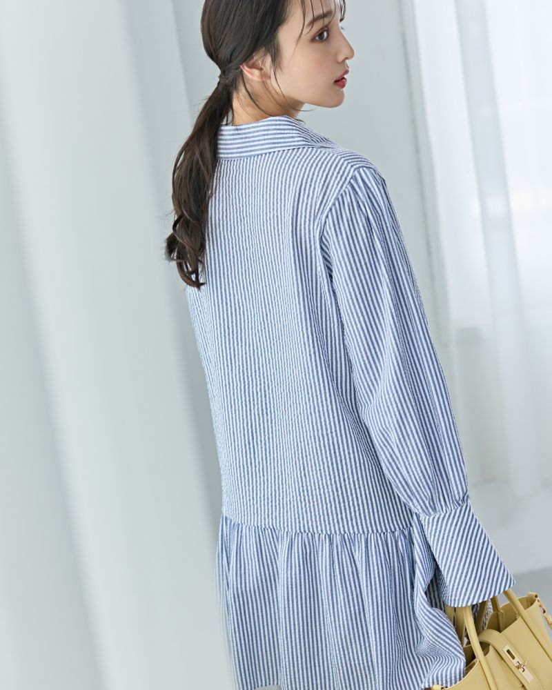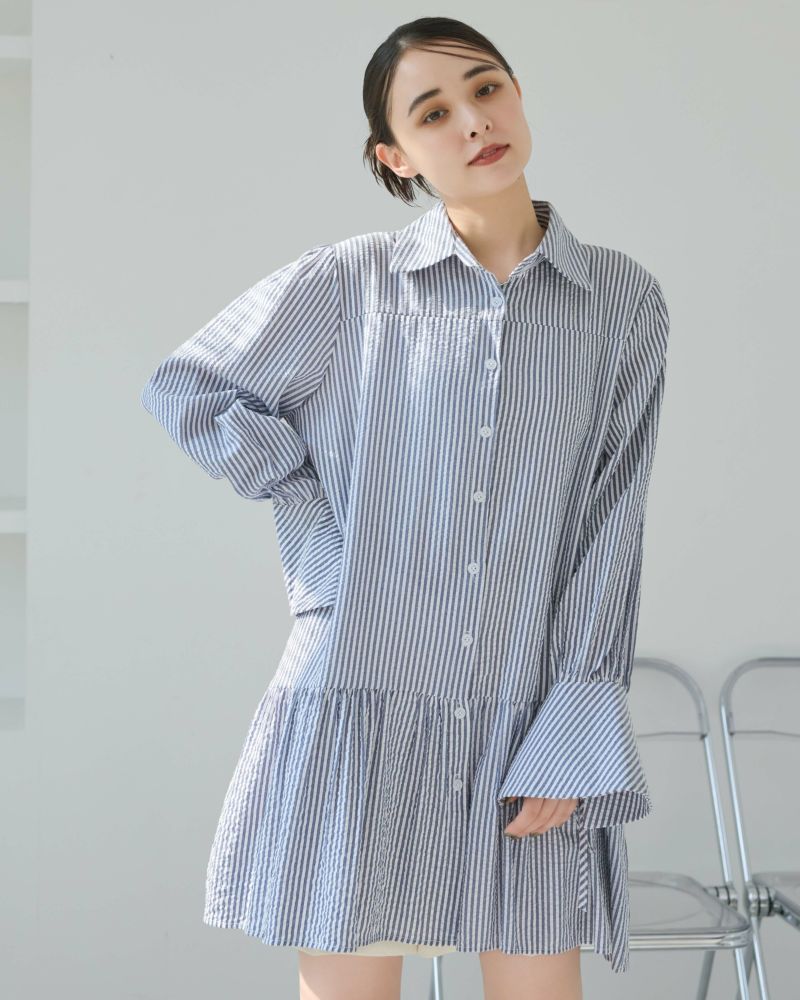 ストライプ柄でミニ丈でも大人カジュアルに。