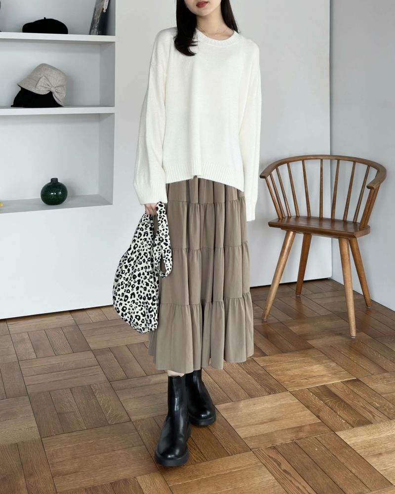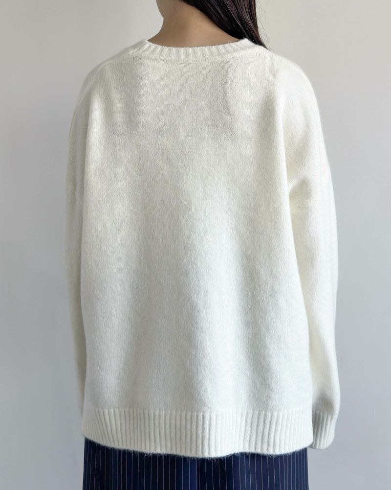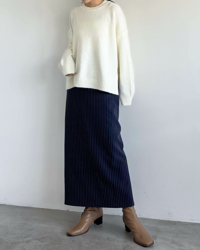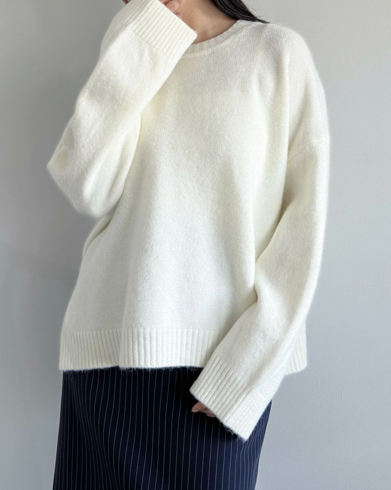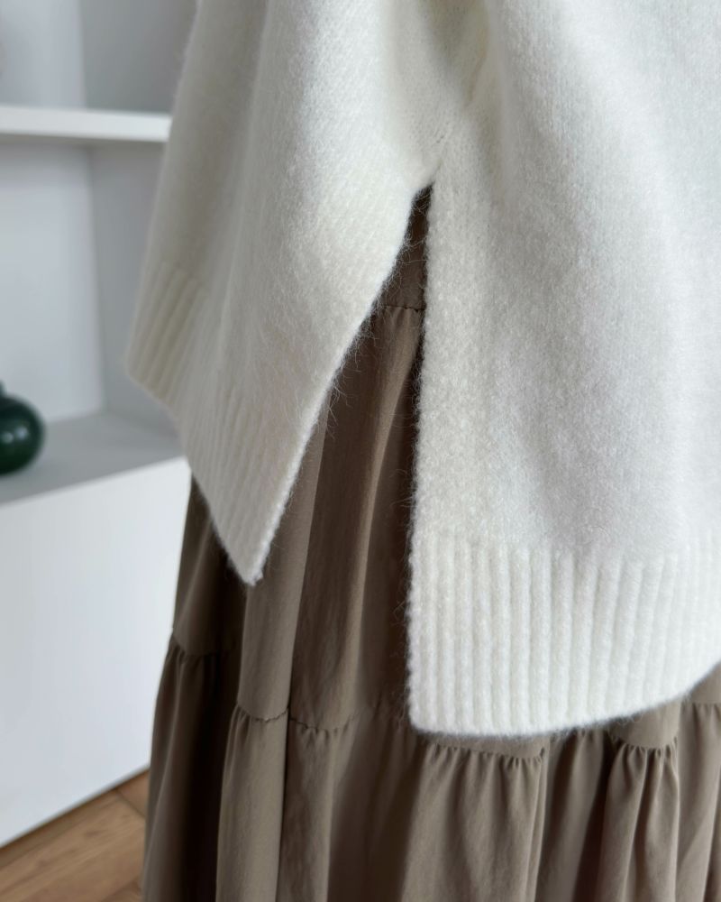 アイボリーかな?厚みのある温かいニットです。厚みがありますが、硬いニットではなく柔らかいです。中に着込まなくてもいい感じです。おしりも隠れるのでニットスカートを履いてもラインを気にしなくてもいいのはうれしいです。形はシンプルなので何にでも合わせやすいと思います。買ってよかったです。他のカラーが再販されたらまた購入したいです。