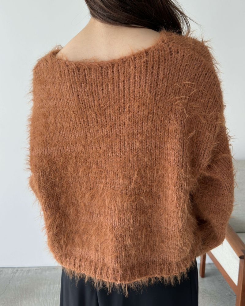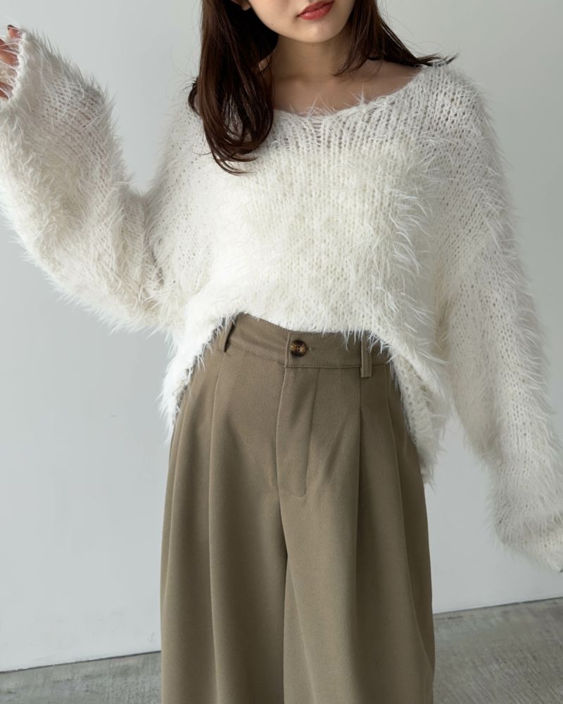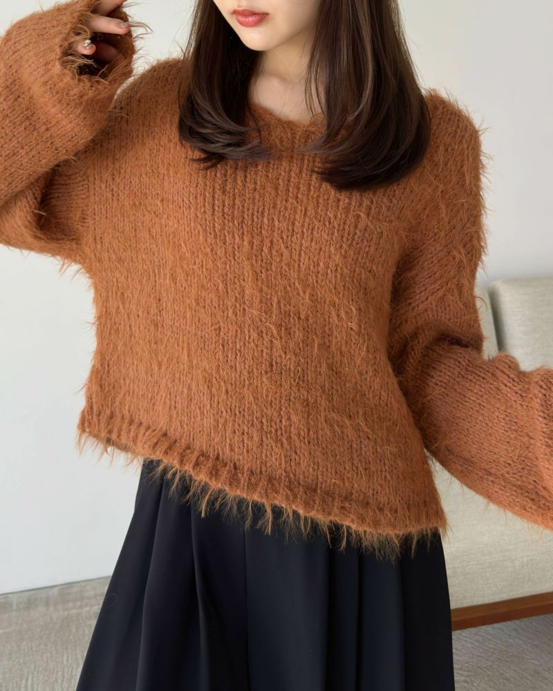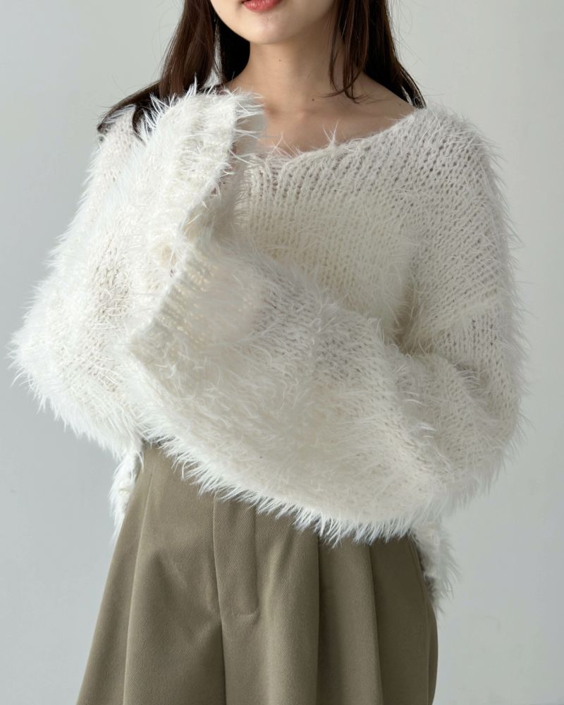 画像通りふわふわシャギーですが、分厚いわけじゃないので着膨れしません!むしろ思ったより薄手でした!フロントクラッシュも全然きになりませんでした。インスタライブで紹介されていたグレーのプリーツスカートに合わせると最強に大人可愛いです!静電気バチバチが1番すごかったので、スプレー必須です!