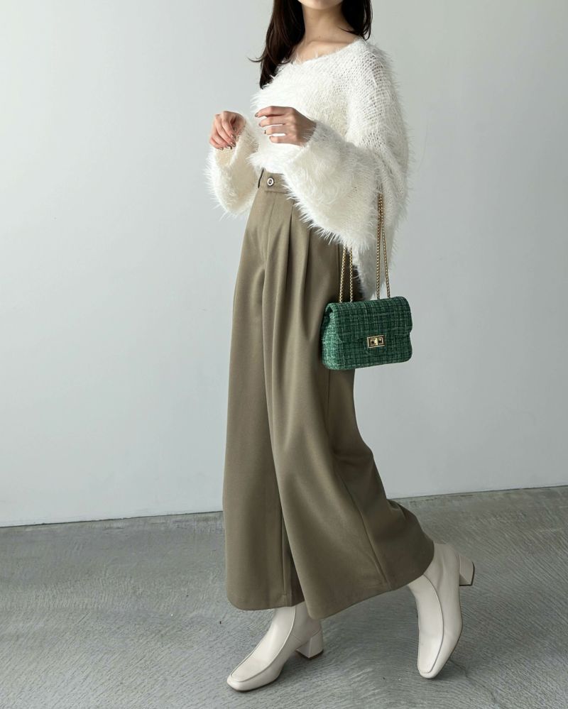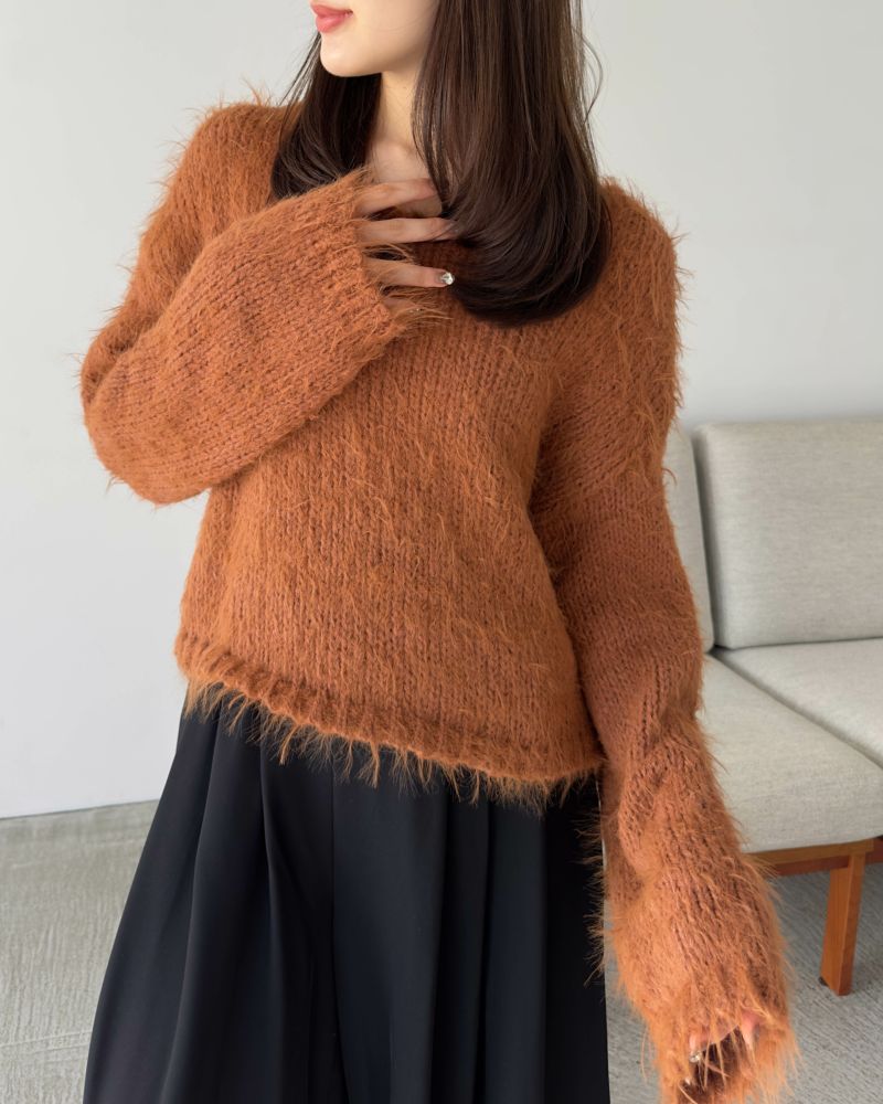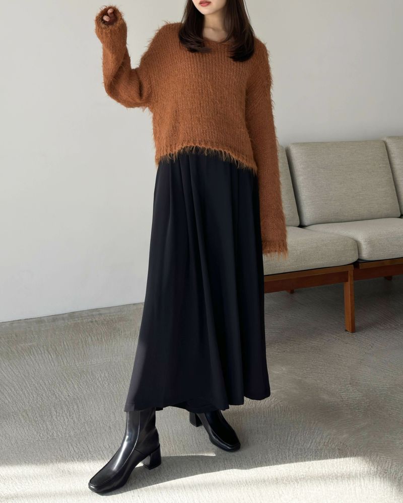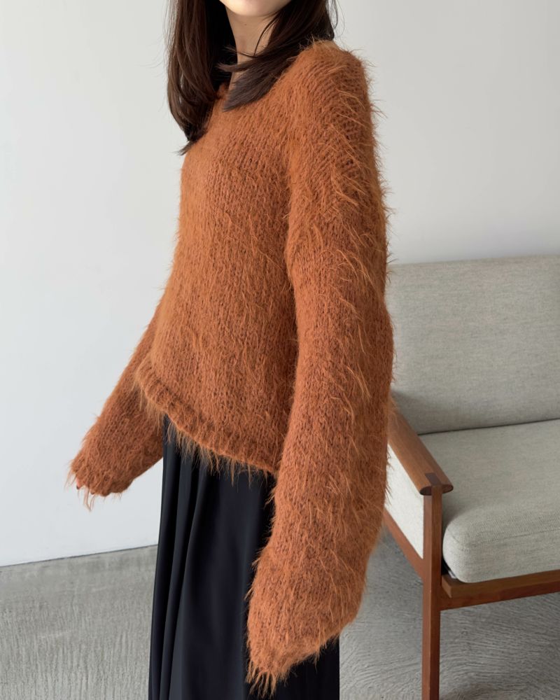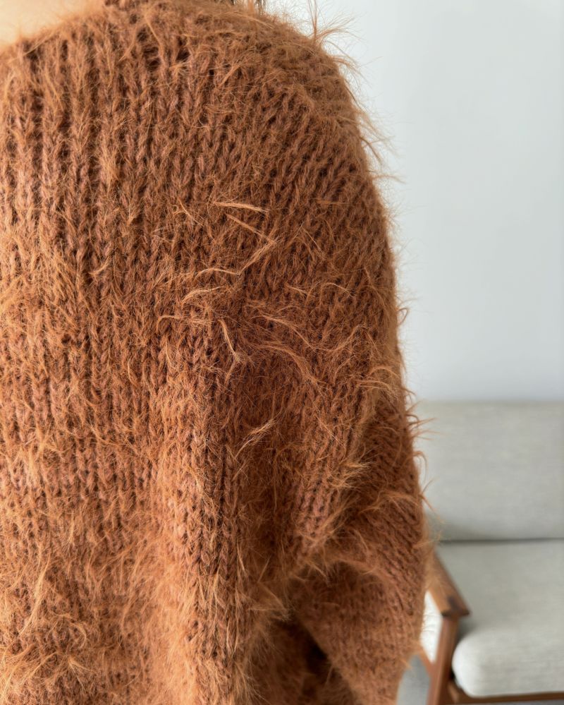 画像通りふわふわシャギーですが、分厚いわけじゃないので着膨れしません!むしろ思ったより薄手でした!フロントクラッシュも全然きになりませんでした。インスタライブで紹介されていたグレーのプリーツスカートに合わせると最強に大人可愛いです!静電気バチバチが1番すごかったので、スプレー必須です!