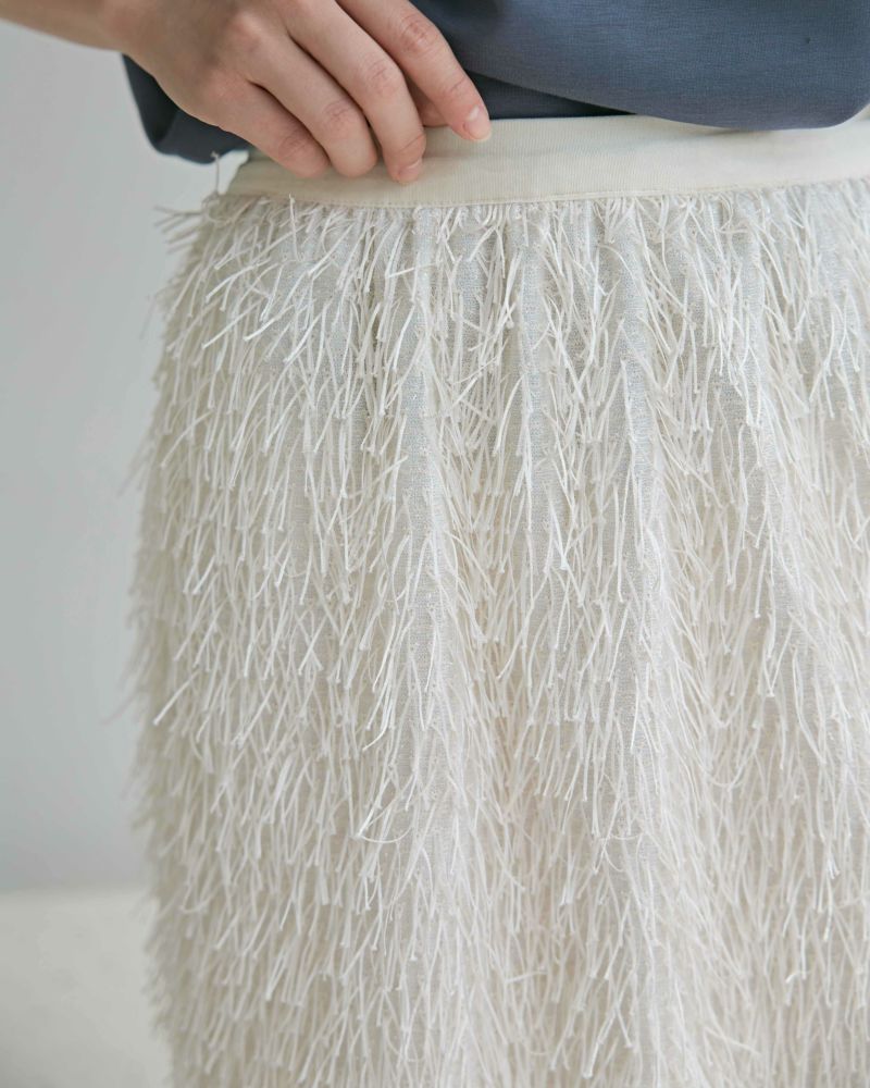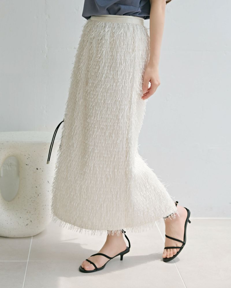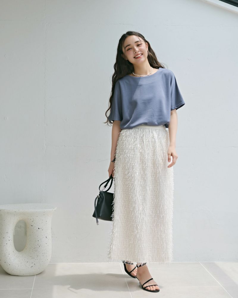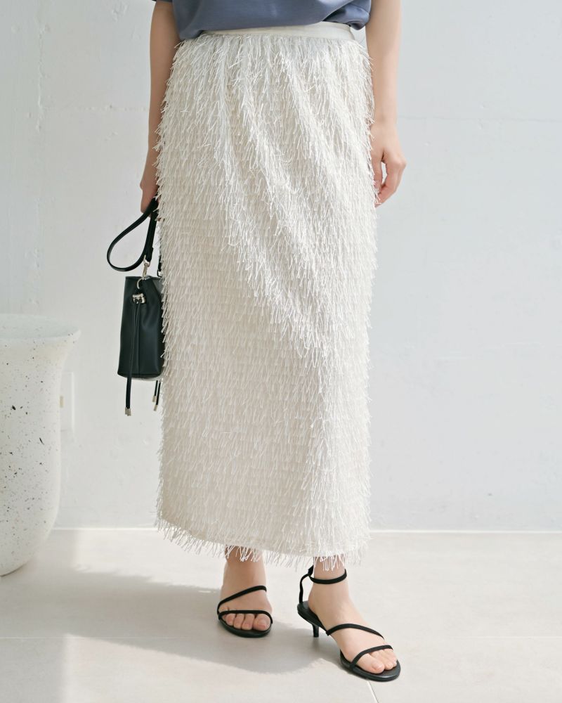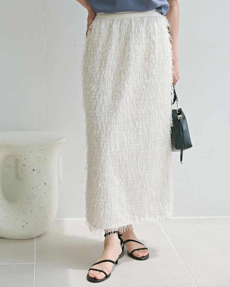 ホワイト購入しました。インスタライブみたくブラックのTシャツとデニムシャツに合わせたいです。思ったより薄手ですが、フリンジも落ちてこないので良かったです。ウエストがちょっとモコモコするので、改善策を探します。透け感は全くない!とは言えないのでインナー気をつけてください。