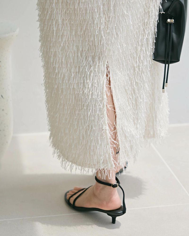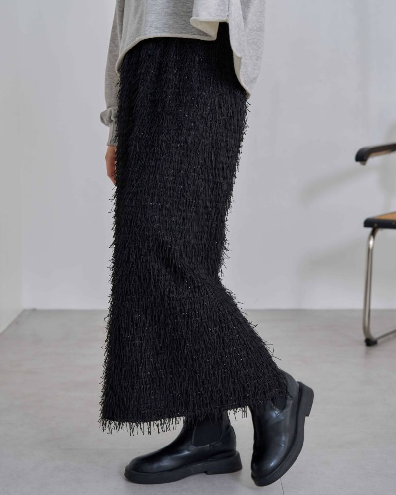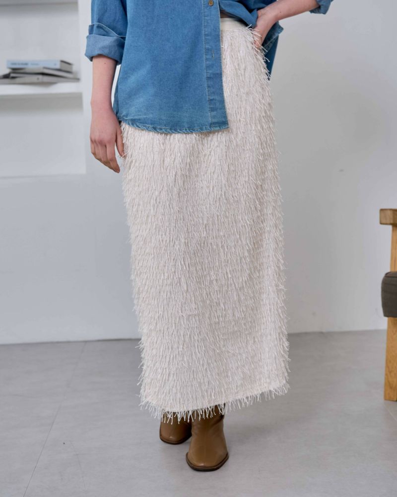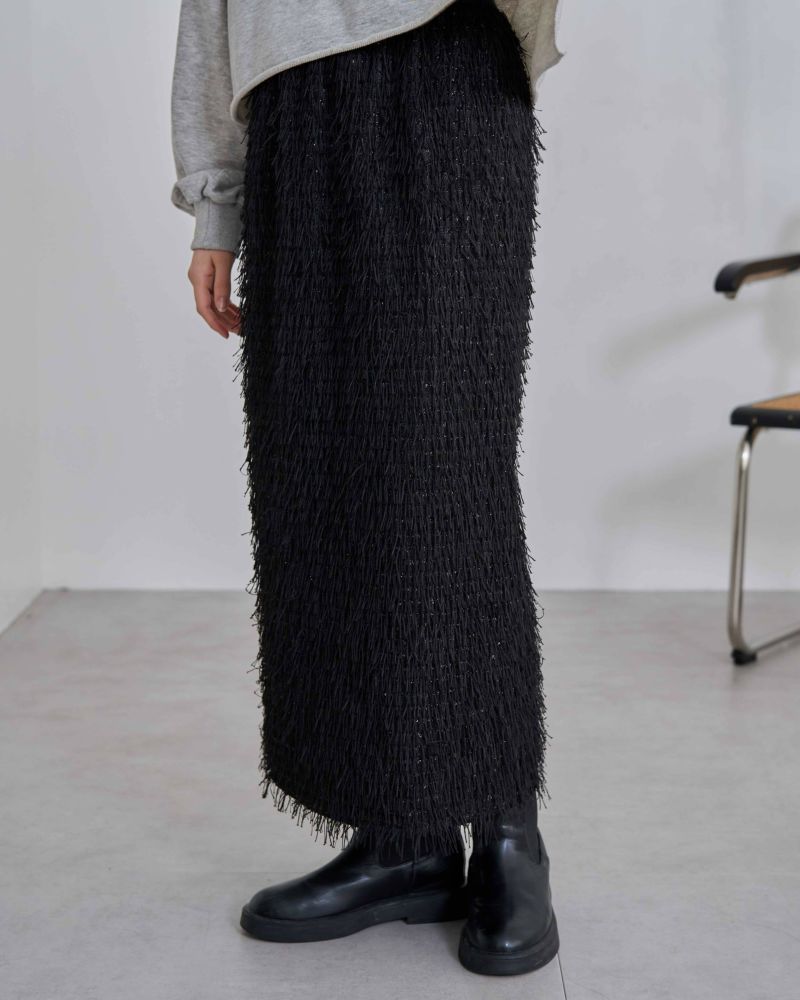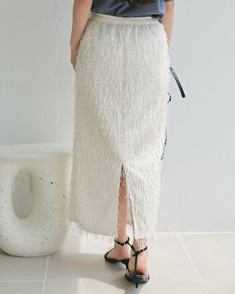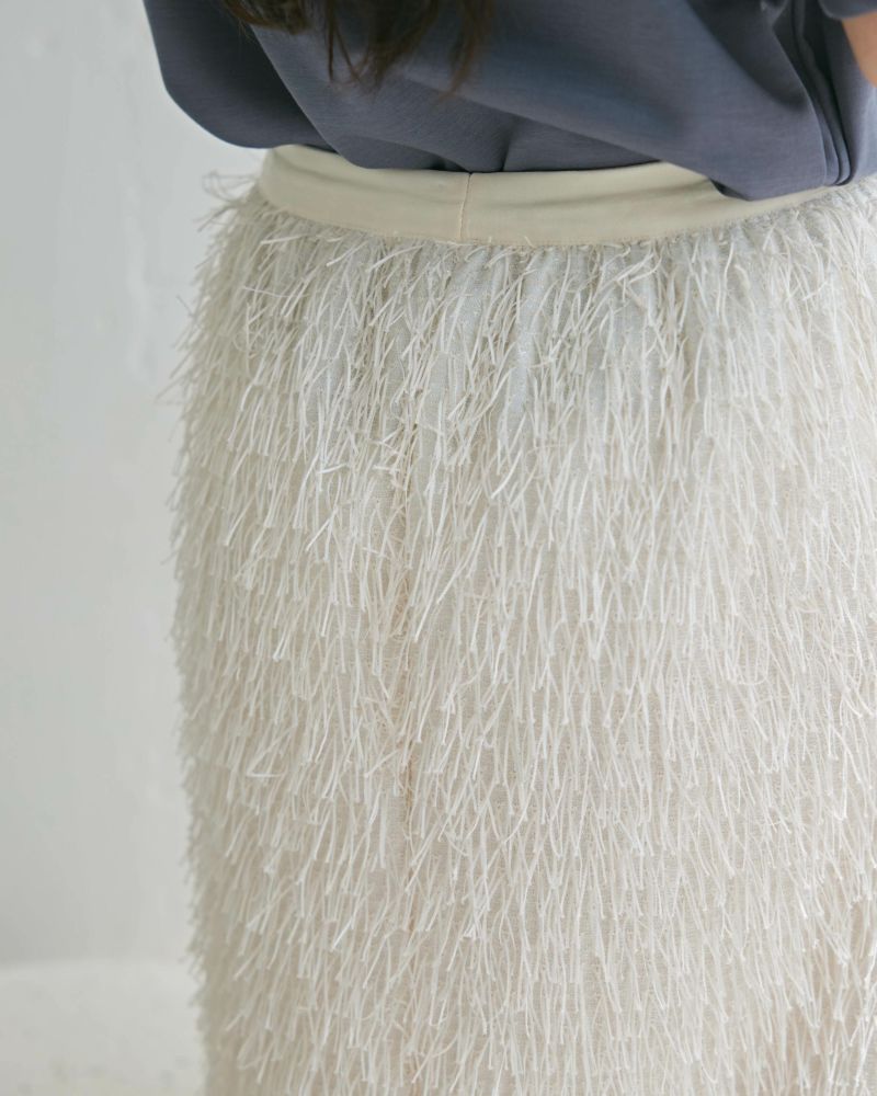 ホワイト購入しました。インスタライブみたくブラックのTシャツとデニムシャツに合わせたいです。思ったより薄手ですが、フリンジも落ちてこないので良かったです。ウエストがちょっとモコモコするので、改善策を探します。透け感は全くない!とは言えないのでインナー気をつけてください。