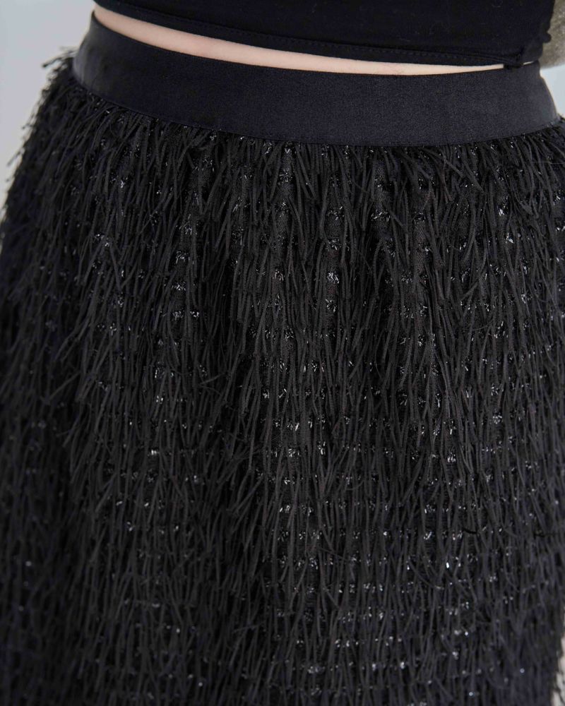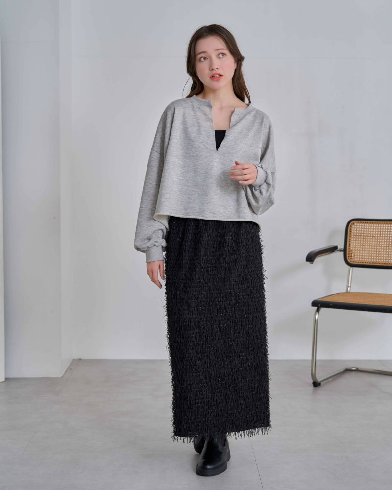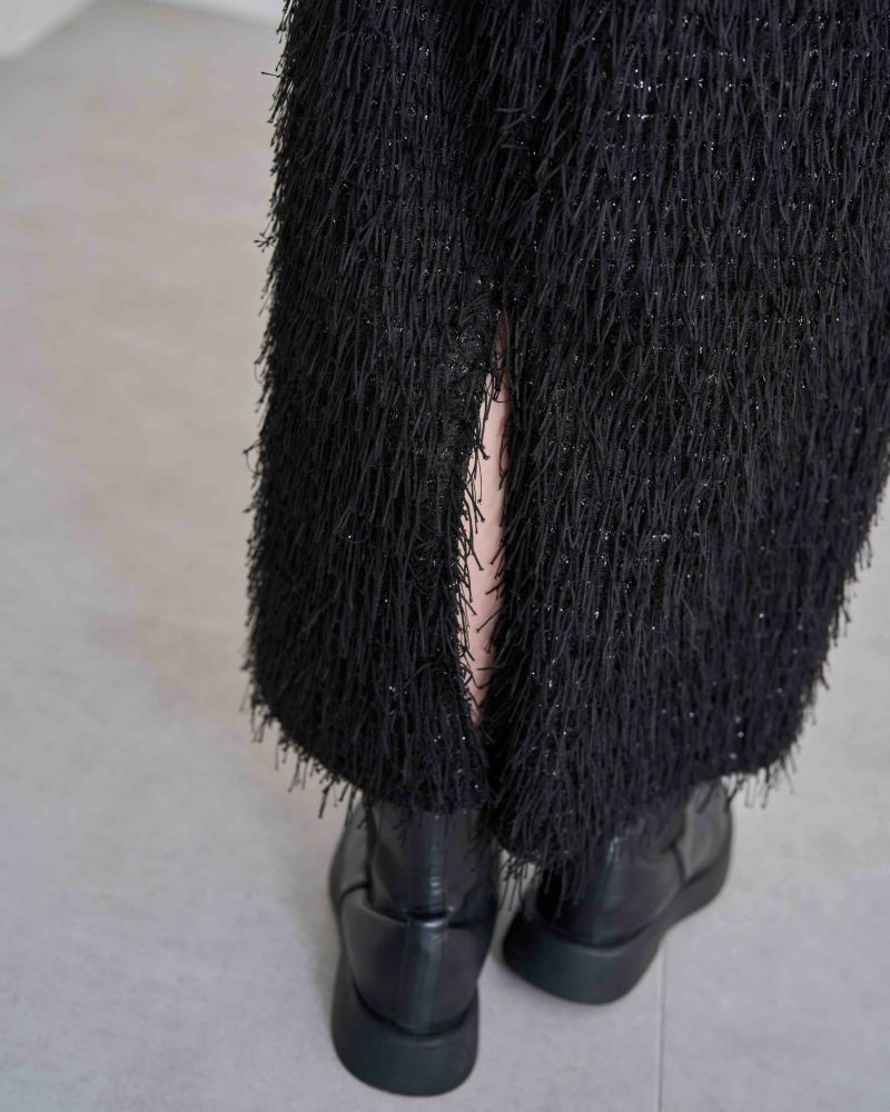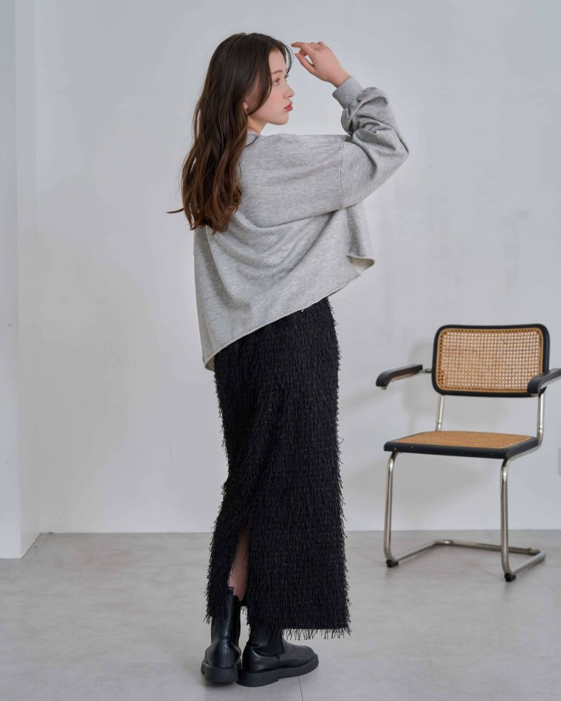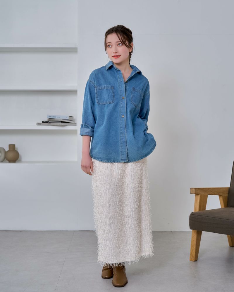ホワイト購入しました。インスタライブみたくブラックのTシャツとデニムシャツに合わせたいです。思ったより薄手ですが、フリンジも落ちてこないので良かったです。ウエストがちょっとモコモコするので、改善策を探します。透け感は全くない!とは言えないのでインナー気をつけてください。