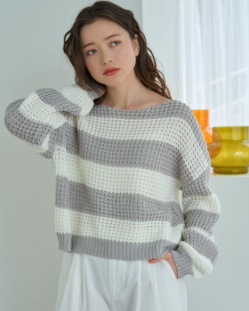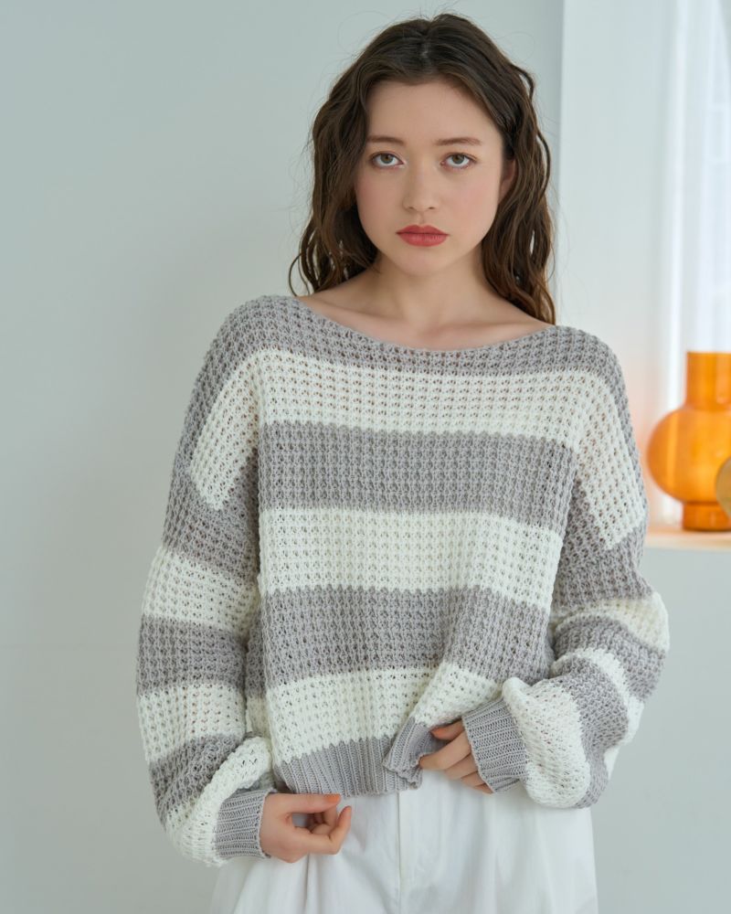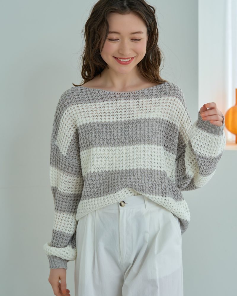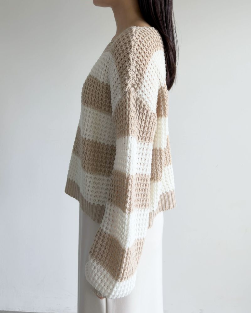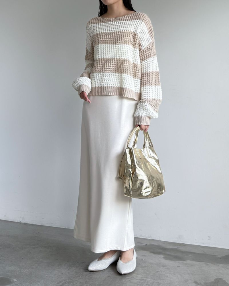 モデルのオフホワイトのタイトスカートに合わせたくてベージュ購入。首のあきをきにしてましたが、思ったよりあきが狭く、露出感もないです。丈もインしてもしなくてもよさそう!生地もインナーとこのニット1枚なら夏まで着れそう。ボーダーの柄のおかげで編み目からの透け感もきにならないです。