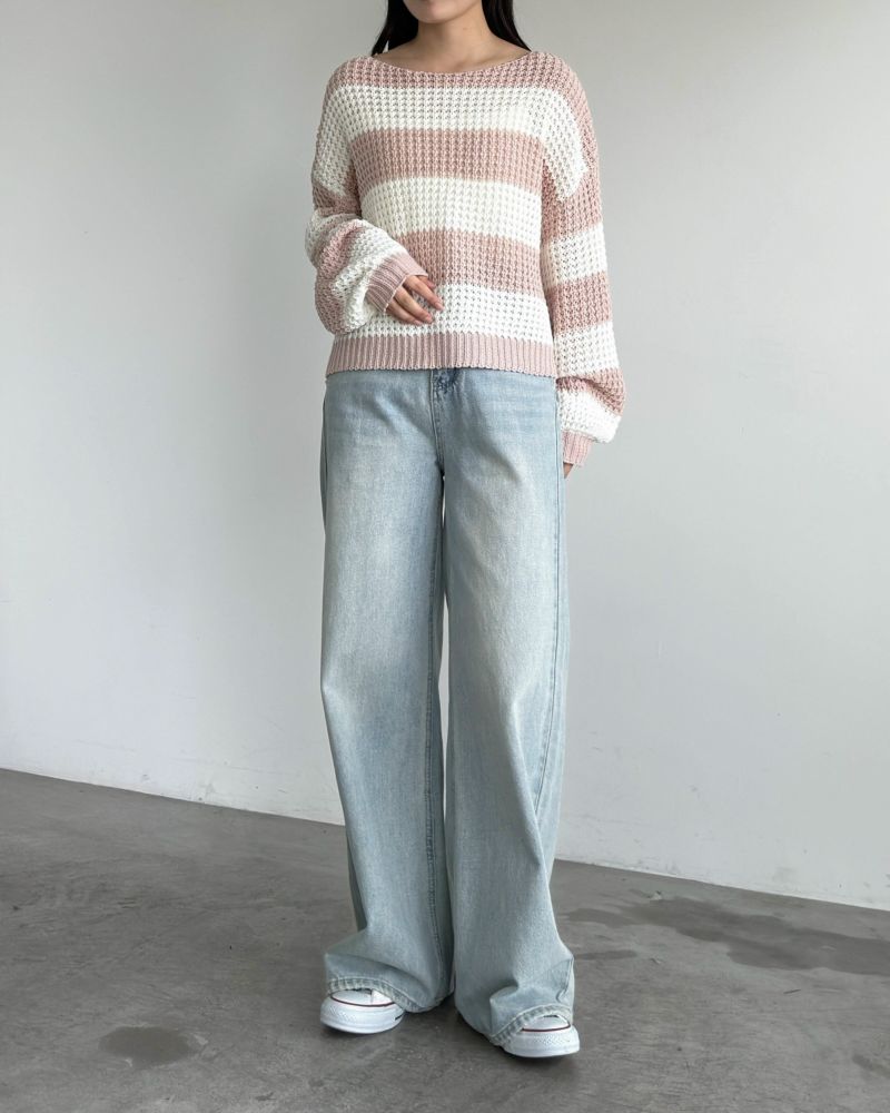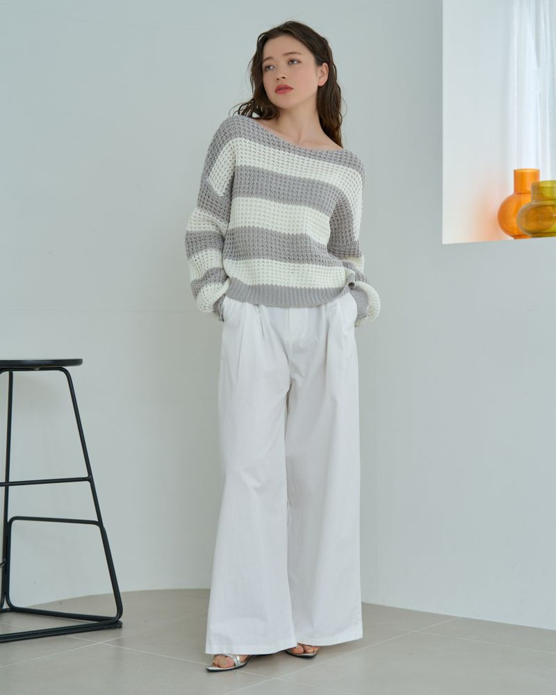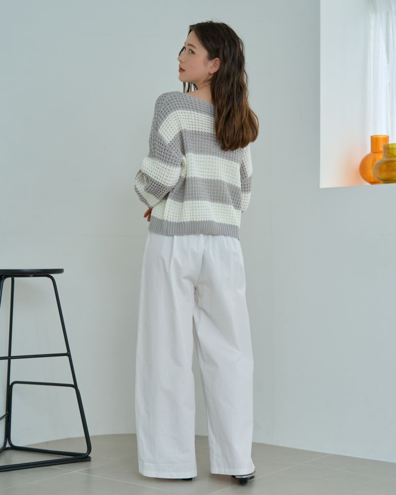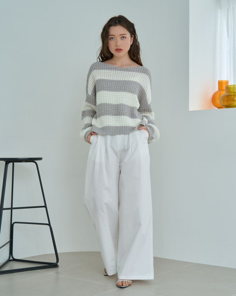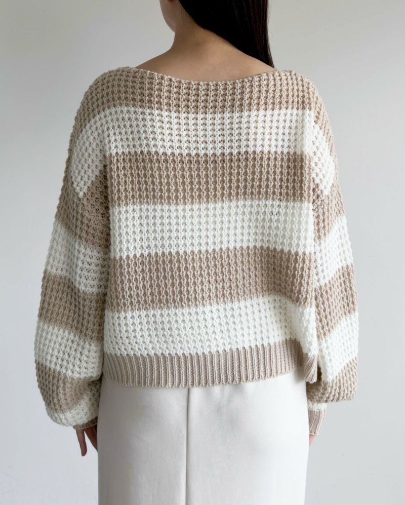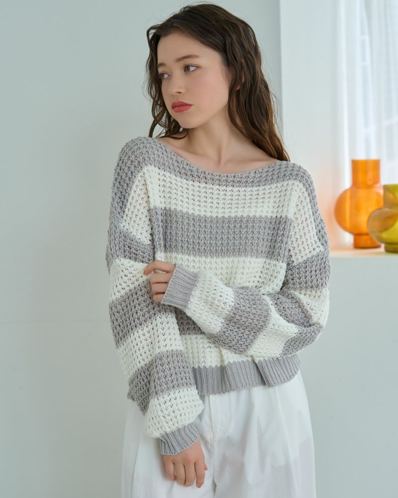 モデルのオフホワイトのタイトスカートに合わせたくてベージュ購入。首のあきをきにしてましたが、思ったよりあきが狭く、露出感もないです。丈もインしてもしなくてもよさそう!生地もインナーとこのニット1枚なら夏まで着れそう。ボーダーの柄のおかげで編み目からの透け感もきにならないです。