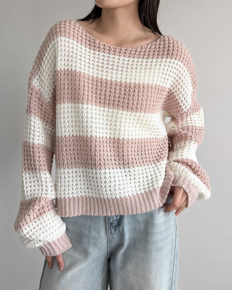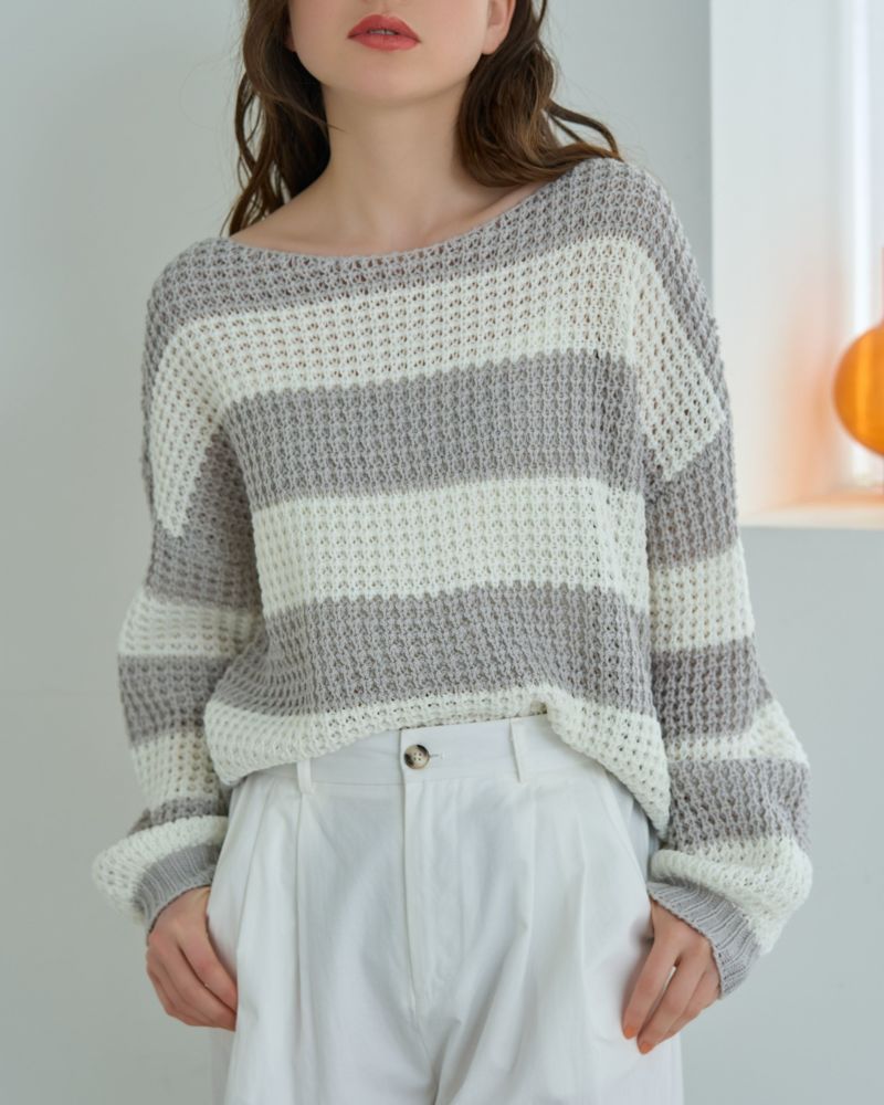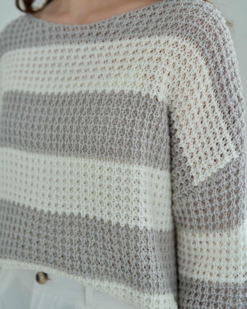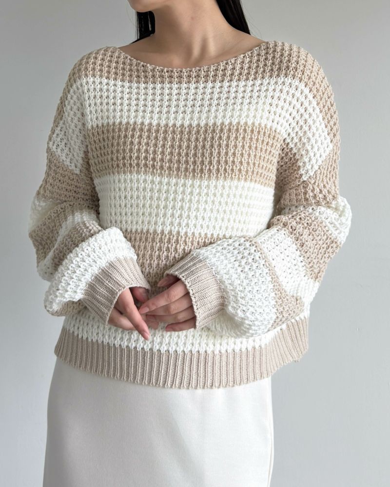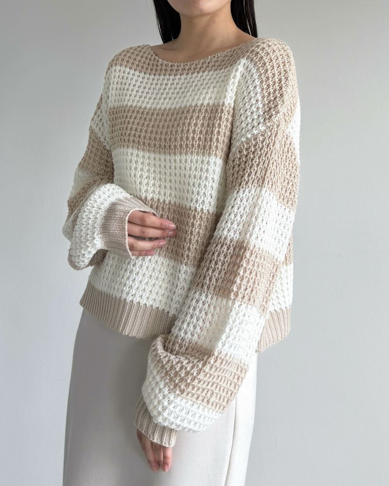 モデルのオフホワイトのタイトスカートに合わせたくてベージュ購入。首のあきをきにしてましたが、思ったよりあきが狭く、露出感もないです。丈もインしてもしなくてもよさそう!生地もインナーとこのニット1枚なら夏まで着れそう。ボーダーの柄のおかげで編み目からの透け感もきにならないです。