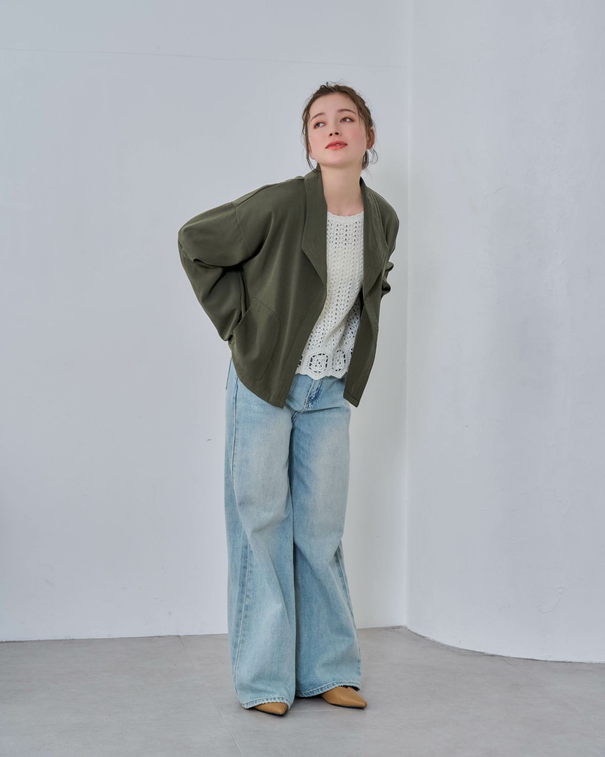ノーカラーフレアスリーブフェイクレザーブルゾン