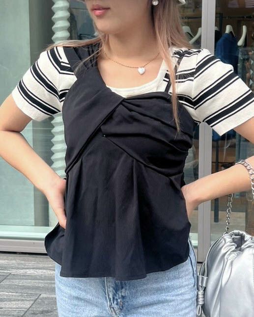 黒のビスチェとセットで購入❣️ビスチェ合わせももちろん可愛いけど単品でも十分可愛い!丈感もインしなくて着れるいいだけ感でした!!!胸元の開きも気にならず綺麗にデコルテみてる感じでした🫶❤️