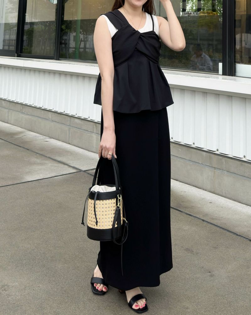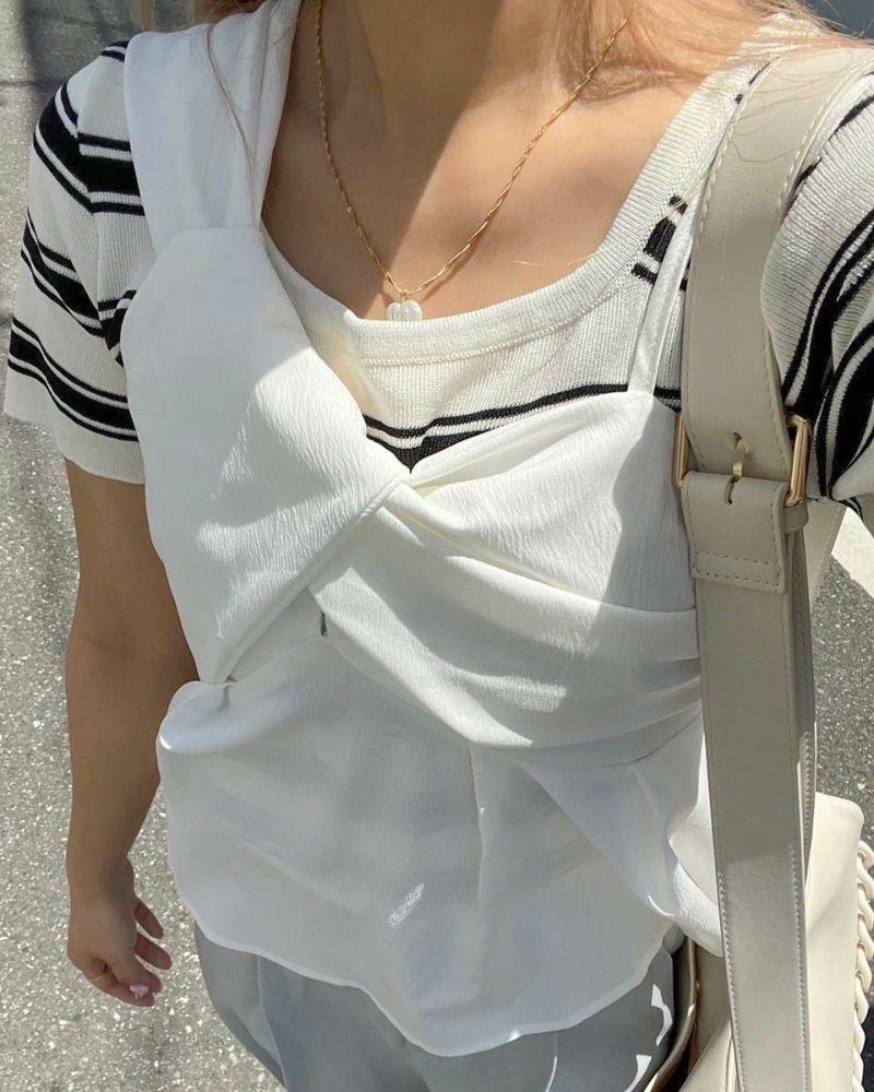たなかちゃん がインスタライブで他店でお高く売ってた…とのコメントを聞き購入を決めました! サイズ感は伸縮性があって、バスト(E)がパツパツにならないか心配でしたが大丈夫でした! Tシャツ、ノースリの上に着たりコーデの幅が広がりそうです♪