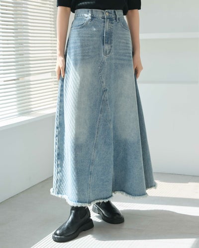 152cm48kg、M購入。丈はSが丁度良いのですが、ウエストとお腹周りが細くないので、丈長いの承知でMにしました。丈感はやよちゃんがLサイズを履いた画像と同じくらいの感じです。床に付かないくらいです。ウエストはMにしたので問題ないのですが、腰で履くとより長くなってしまうので、少し上げてベルトして履きました!スニーカーでも履けます。ハイウエスト気味に履くので足長に見えます😊👍このクオリティで本当にコスパ良すぎ✨他店でデニムスカート見たら7千円でした😅夏は厚底サンダルに合わせたいです🥰買って良かったです💕